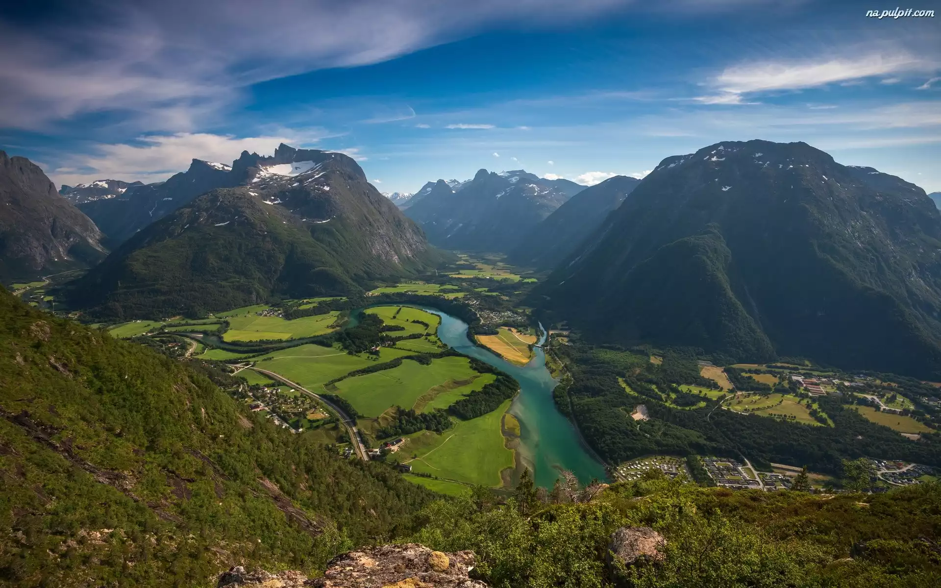 Chmury, Norwegia, Dolina, Rzeka Rauma, Domy, Romsdalen, Góry, Drzewa, Las Na Pulpit