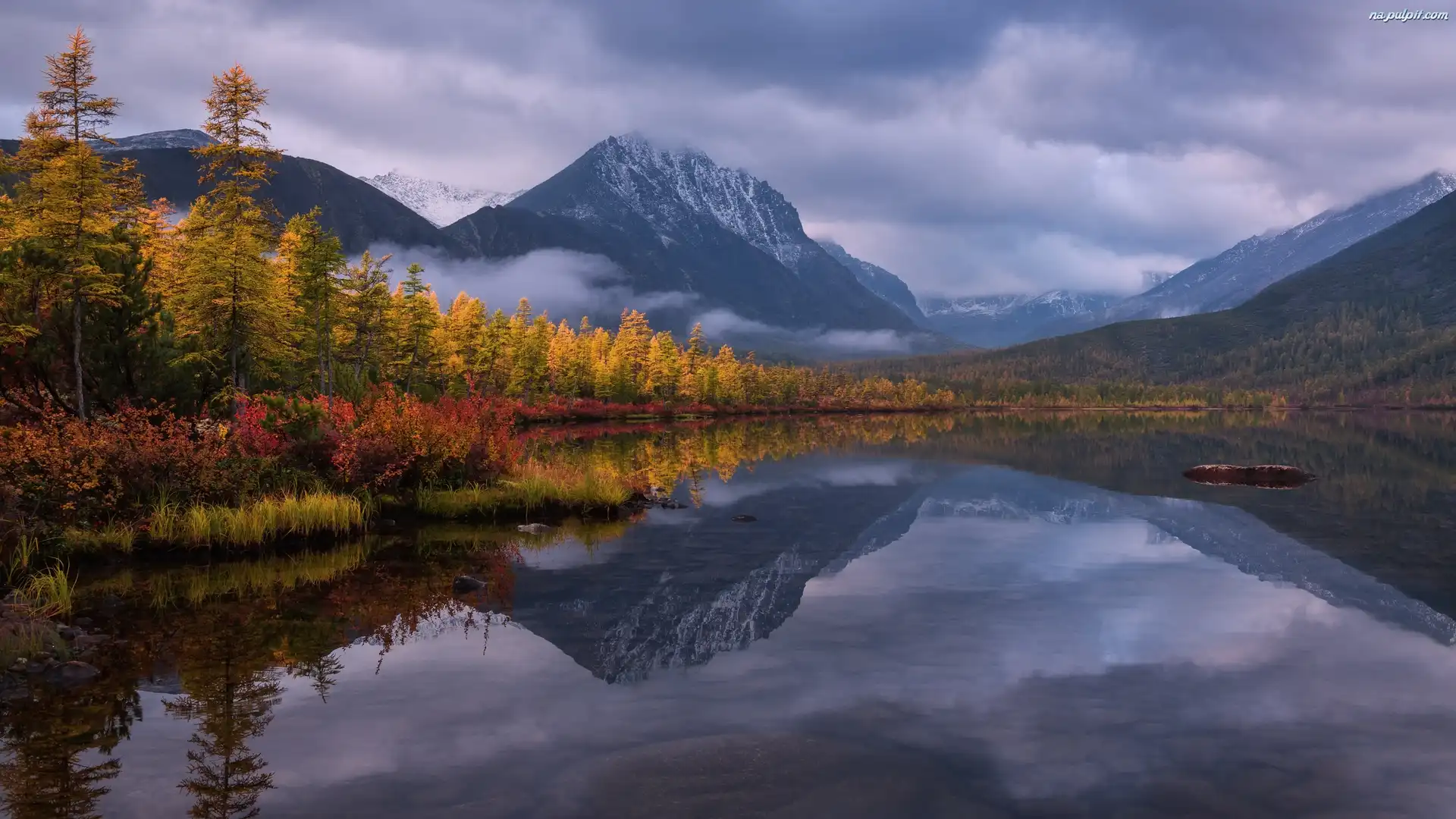 Chmury, Mgła, Kołyma, Jezioro, Jacka Londona, Góry, Rosja, Drzewa, Jesień Na Pulpit