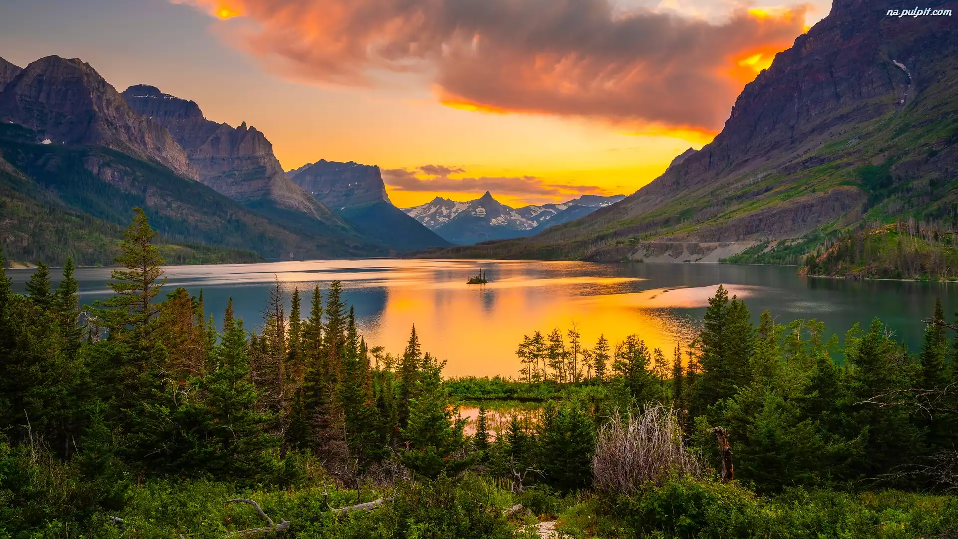 Stan Montana, Stany Zjednoczone, Jezioro, Góry Skaliste, Drzewa, Saint Mary Lake, Park Narodowy Glacier, Zachód słońca, Chmury Na Pulpit |
