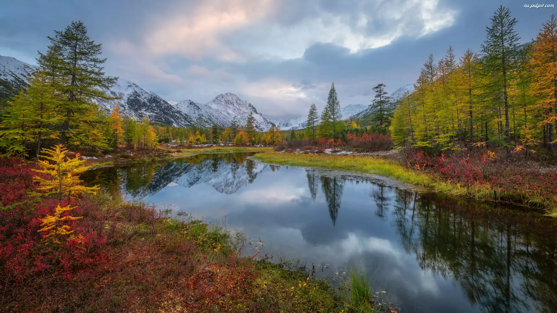 Chmury, Roślinność, Obwód magadański, Góry, Rzeka, Kołyma, Rosja, Drzewa, Jesień Na Pulpit