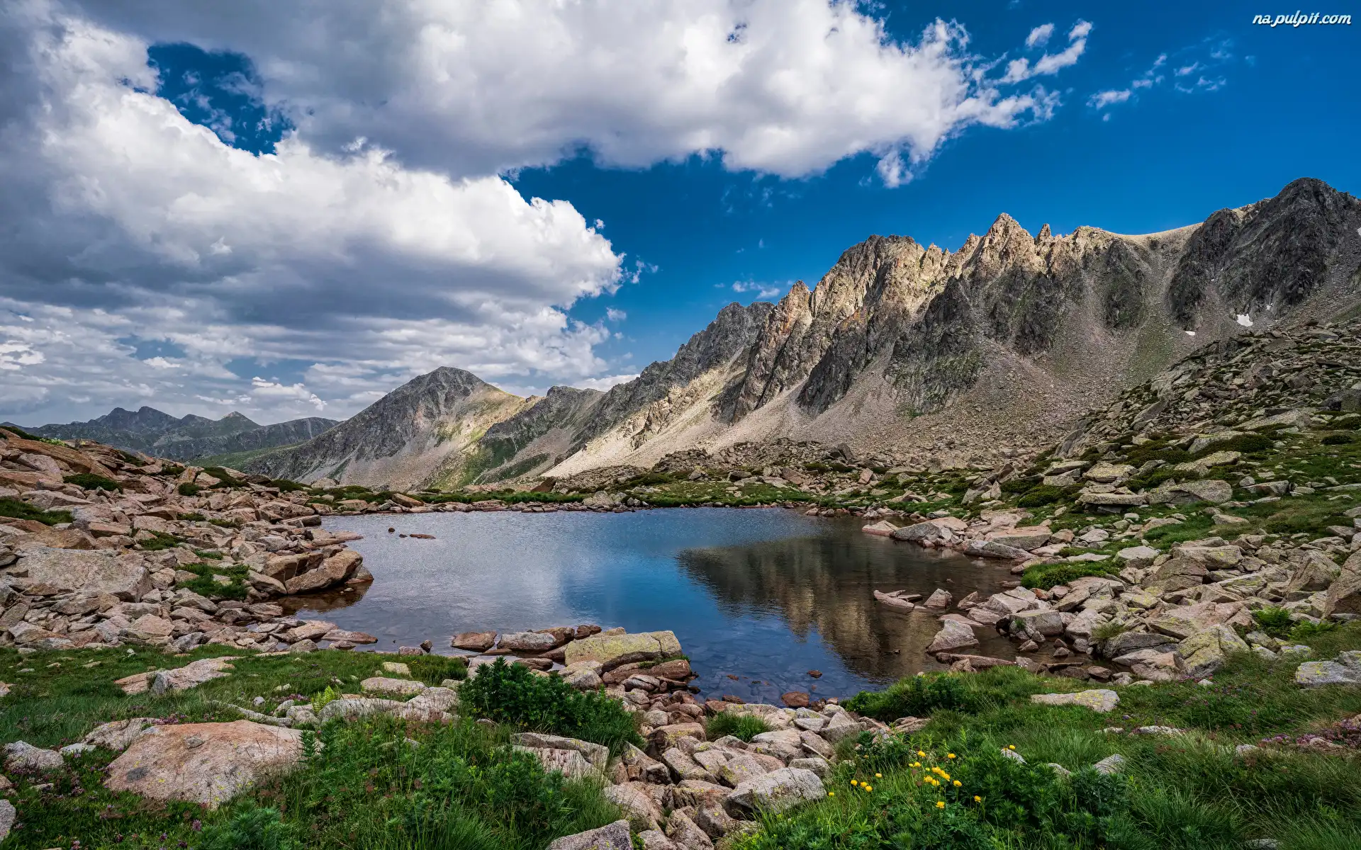 Roślinność, Pireneje, Kamienie, Jezioro, Encamp, Andora, Lake Pessons, Góry, Chmury Na Pulpit