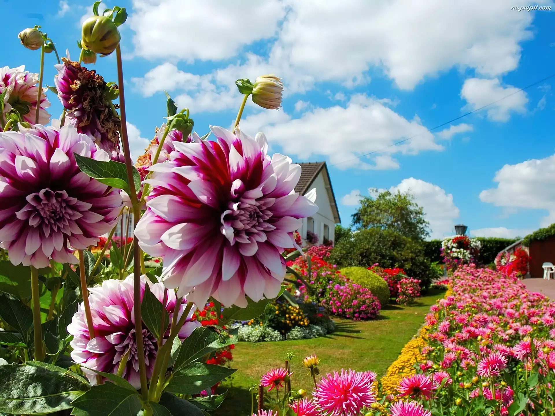 Chmury, Ogród, Georginie, Dom