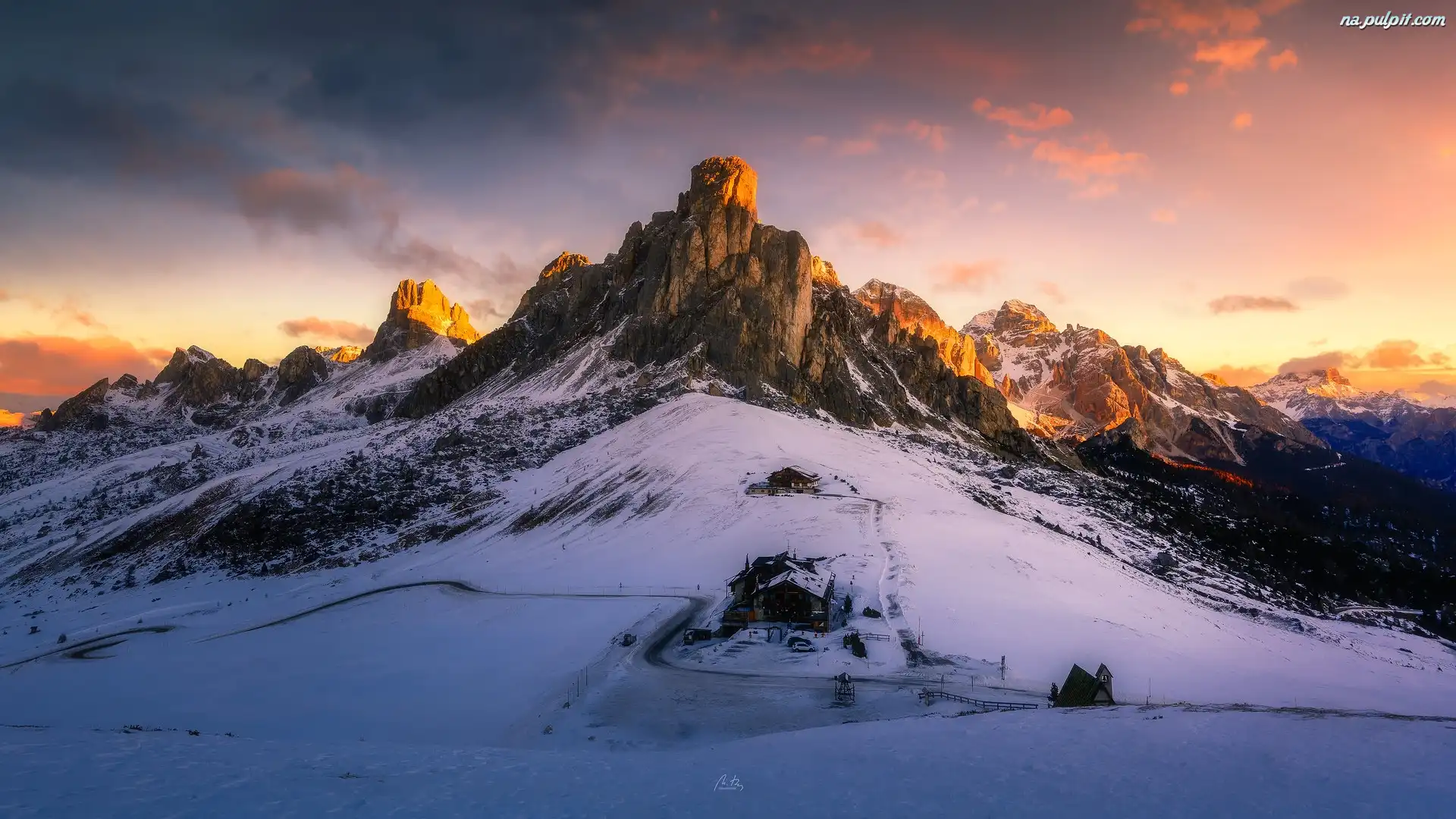 Chmury, Zima, Góry, Góra Ra Gusela, Belluno, Włochy, Dolomity, Przełęcz Giau Pass, Droga