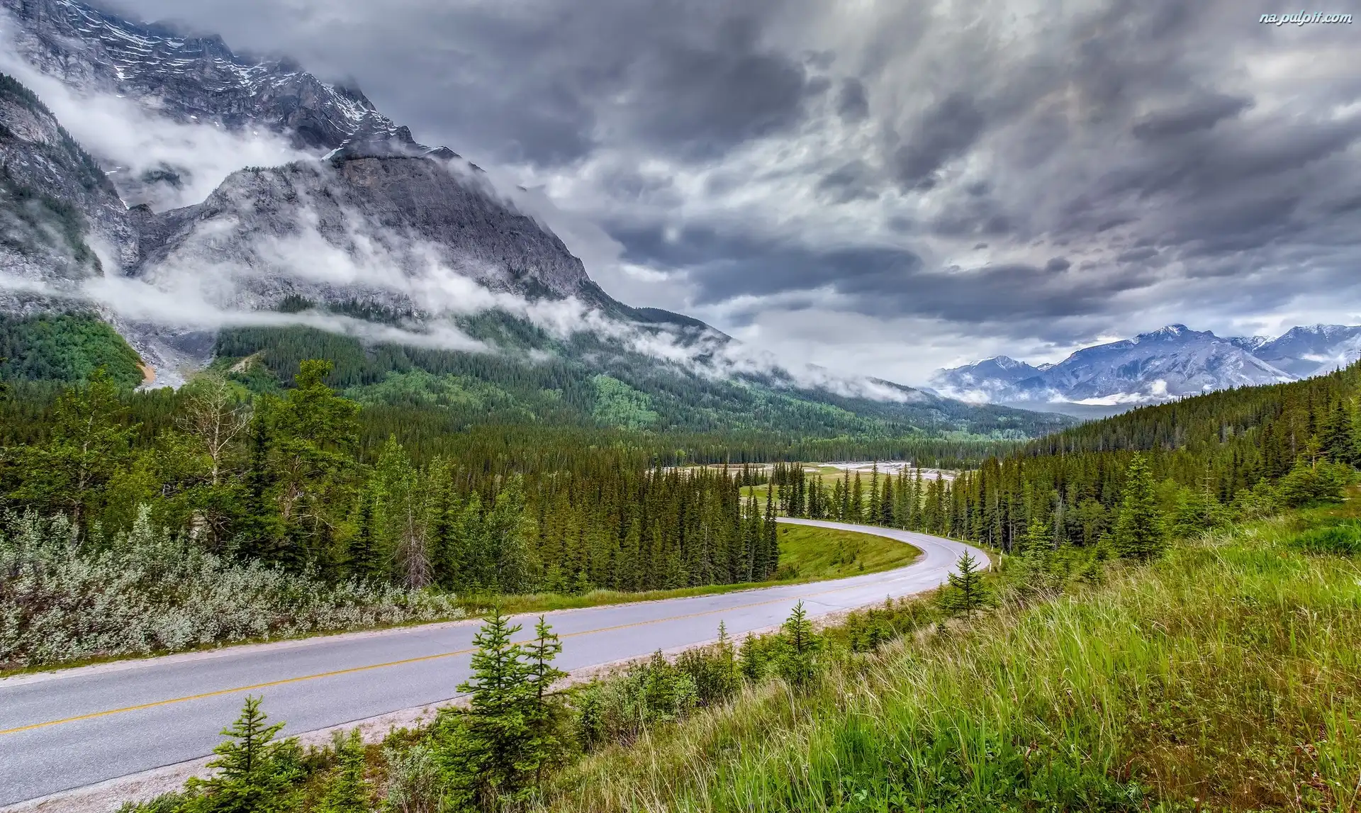 Chmury, Drzewa, Droga, Góry, Lasy Na Pulpit