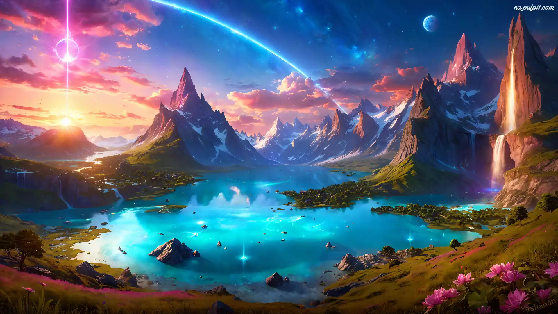 Chmury, Grafika, Niebo, Księżyc, Jezioro, Gwiazdy, Góry, Kamienie, Kwiaty Na Pulpit