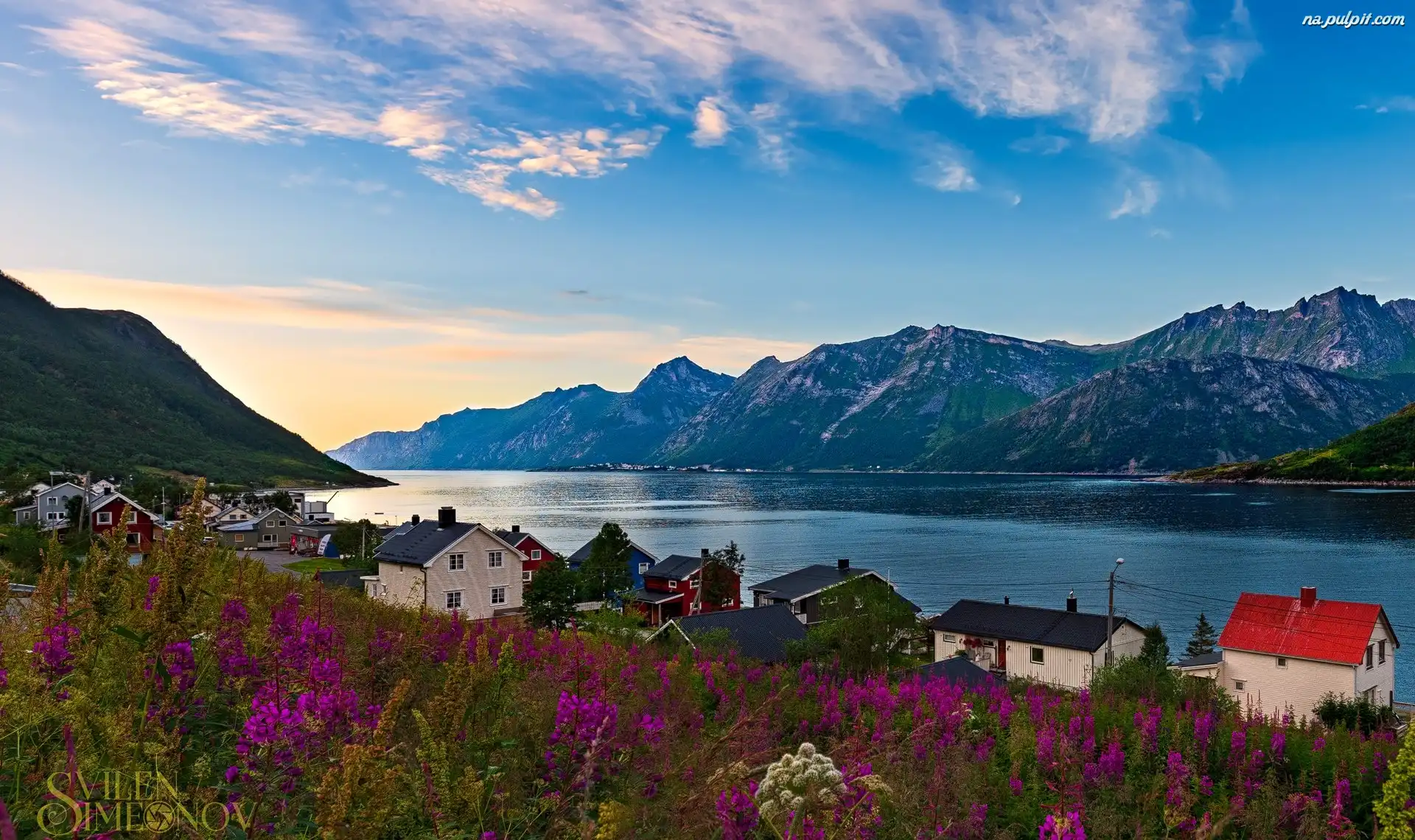 Chmury, Domy, Jezioro, Góry, Roślinność Na Pulpit