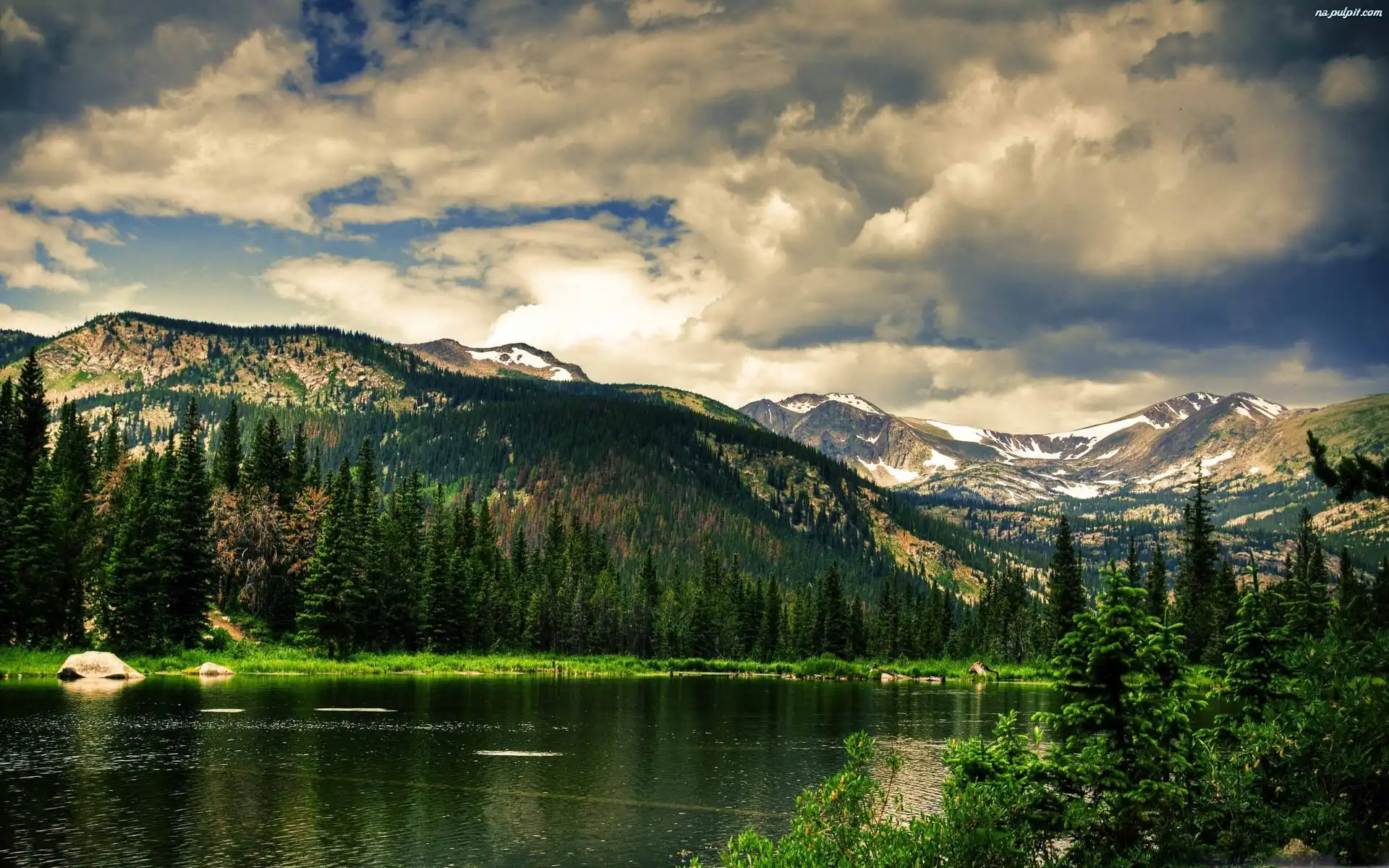 Chmury, Jezioro, Góry, Świerki Na Pulpit