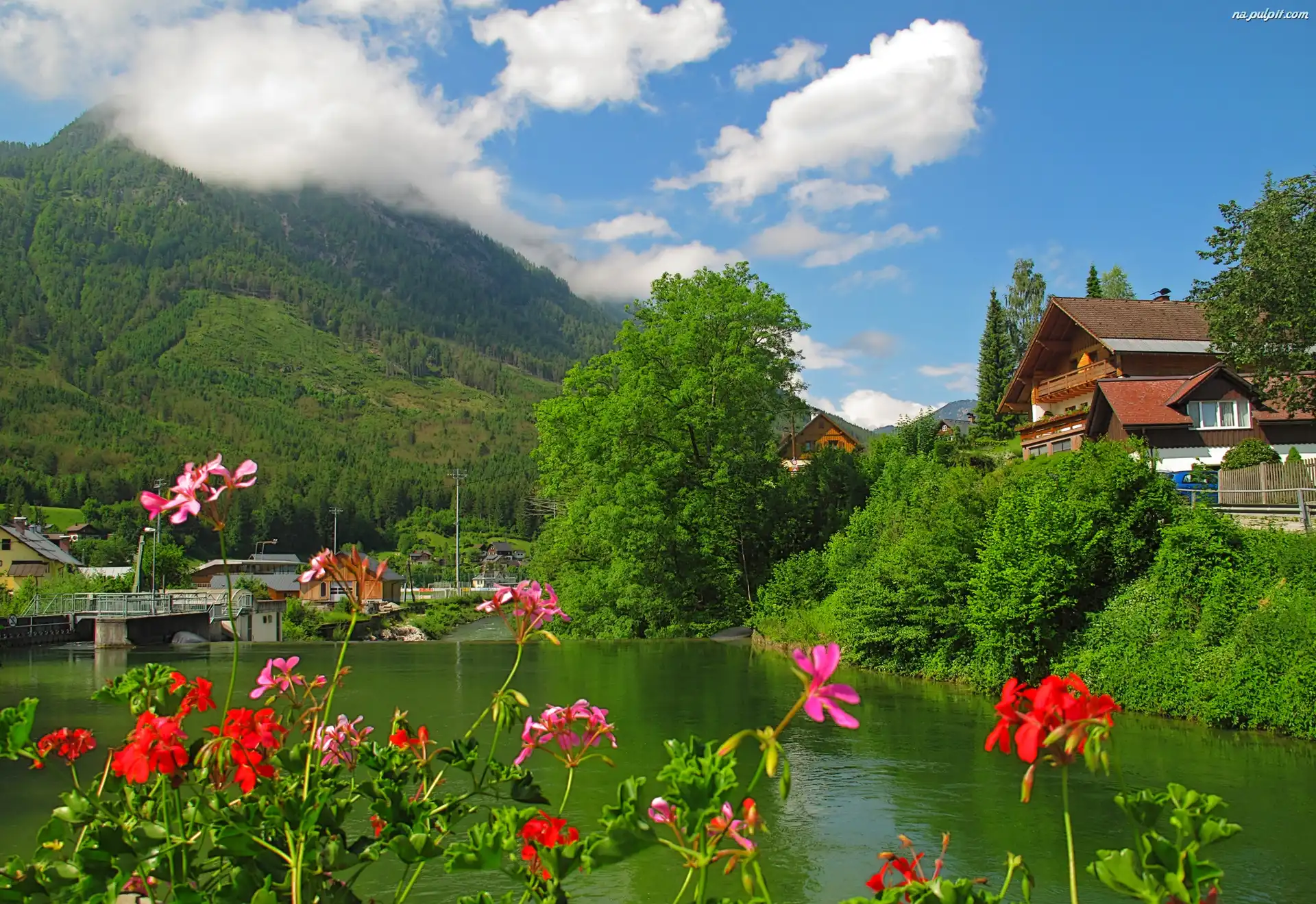 Chmury, Las, Kwiaty, Jezioro, Góry, Domy Na Pulpit