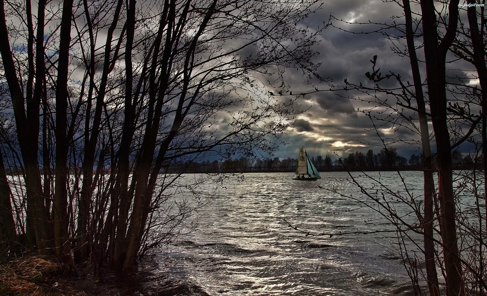 Żaglówka, Jezioro, Chmury, Drzewa