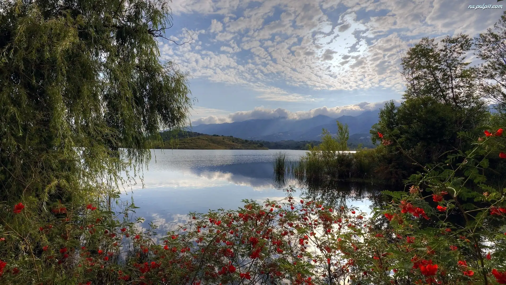 Chmury, Drzewa, Jezioro, Krzewy Na Pulpit