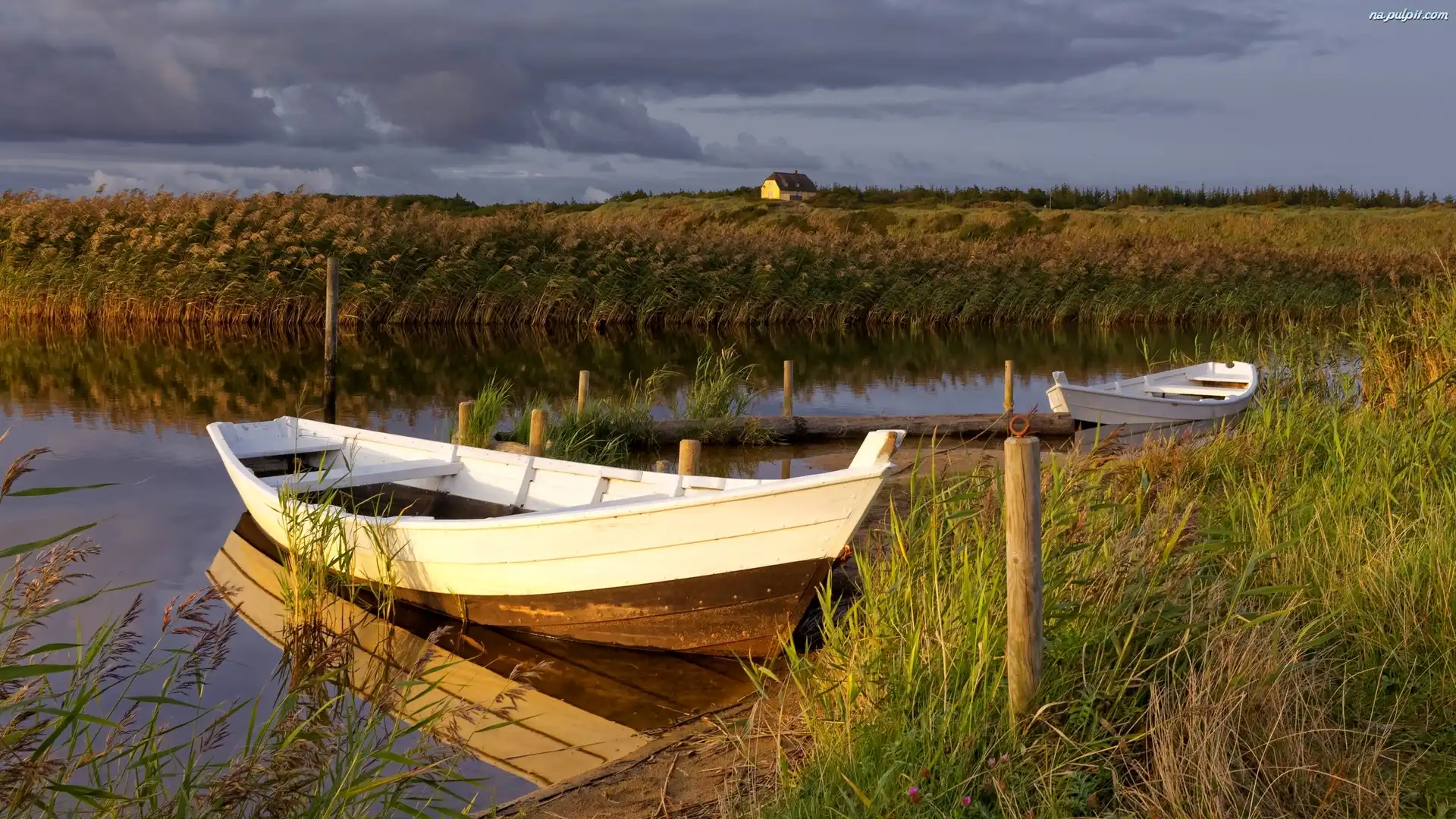 Chmury, Trzciny, Łódki, Jezioro, Dom Na Pulpit