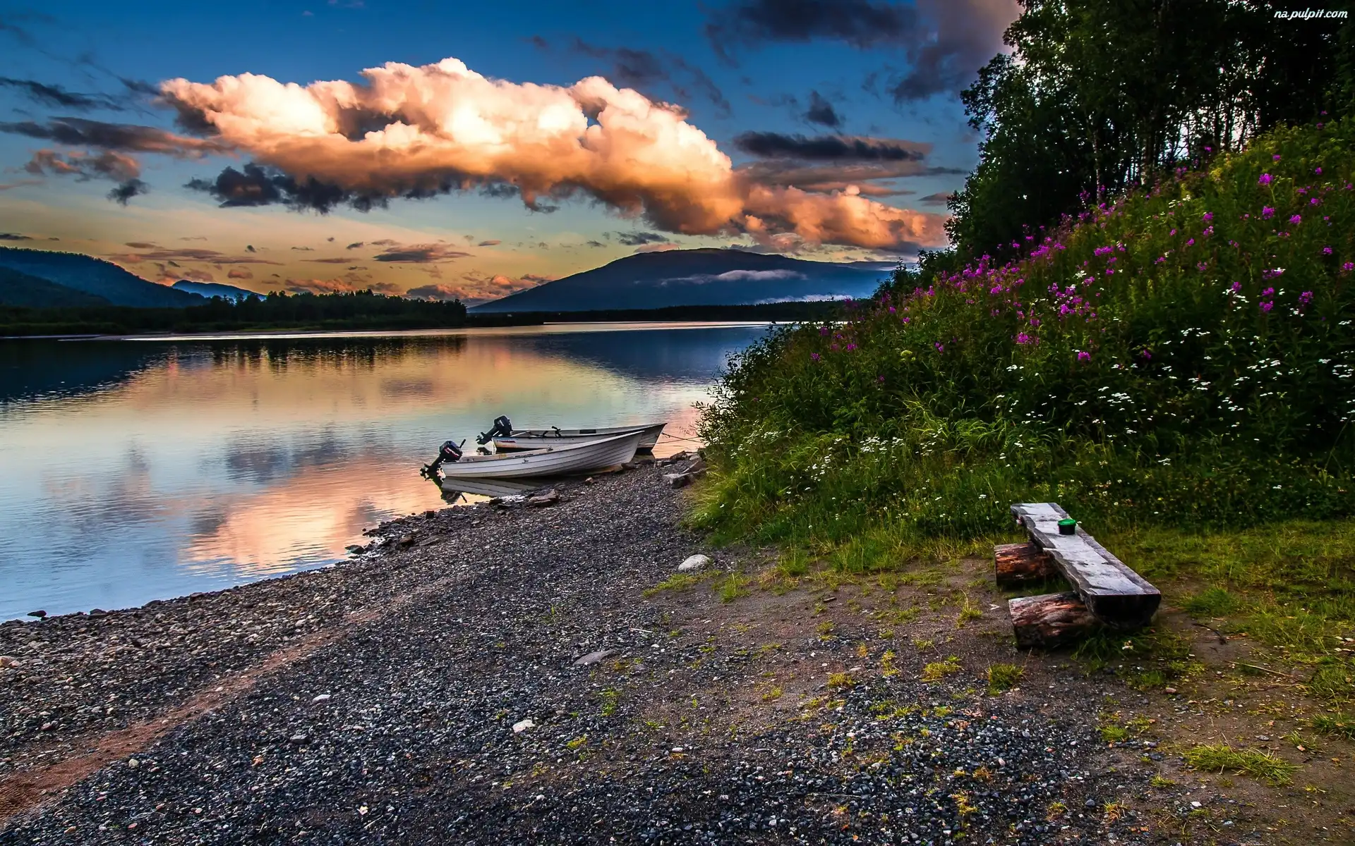 Chmury, Góry, Łodzie, Jezioro, Kwiaty Na Pulpit