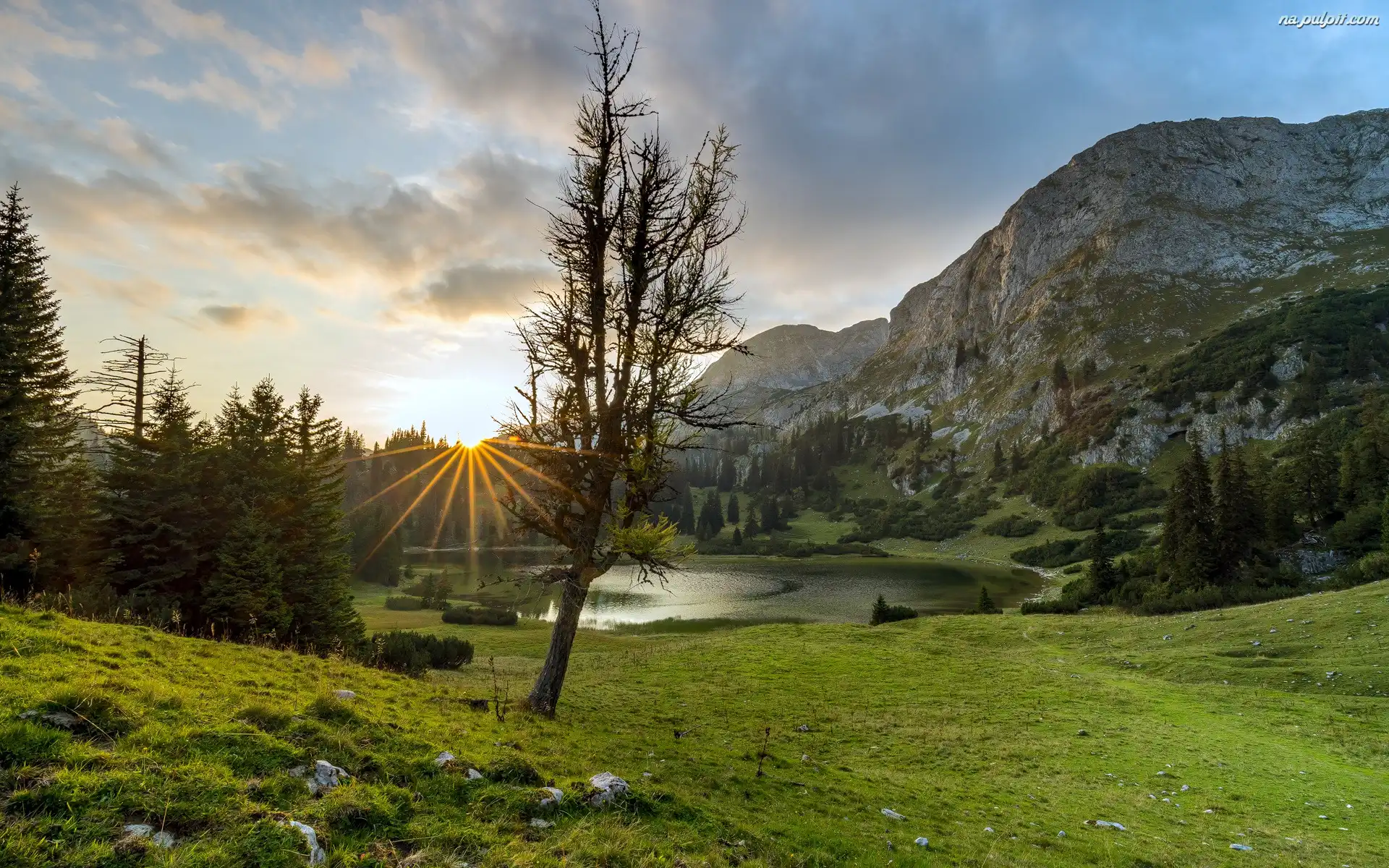 Jezioro, Chmury, Roślinność, Drzewo, Góry, Promienie słońca Na Pulpit