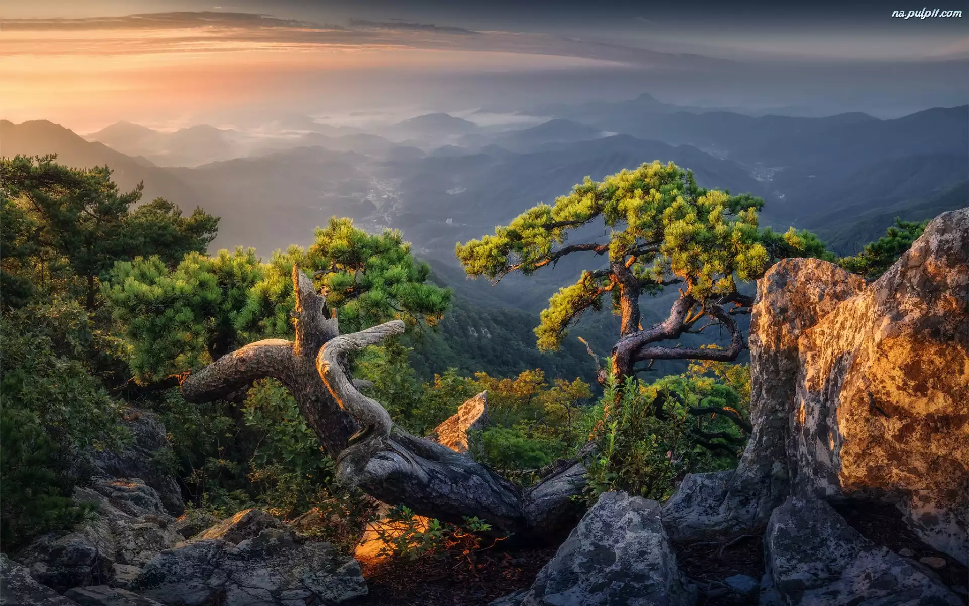 Wschód słońca, Kamienie, Sosny, Góry, Skały, Drzewa, Chmury Na Pulpit