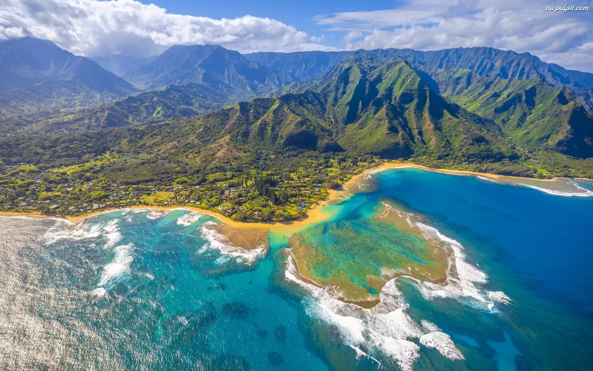 Roślinność, Wyspa Kauai, Morze, Stany Zjednoczone, Z lotu ptaka, Chmury, Hawaje, Góry