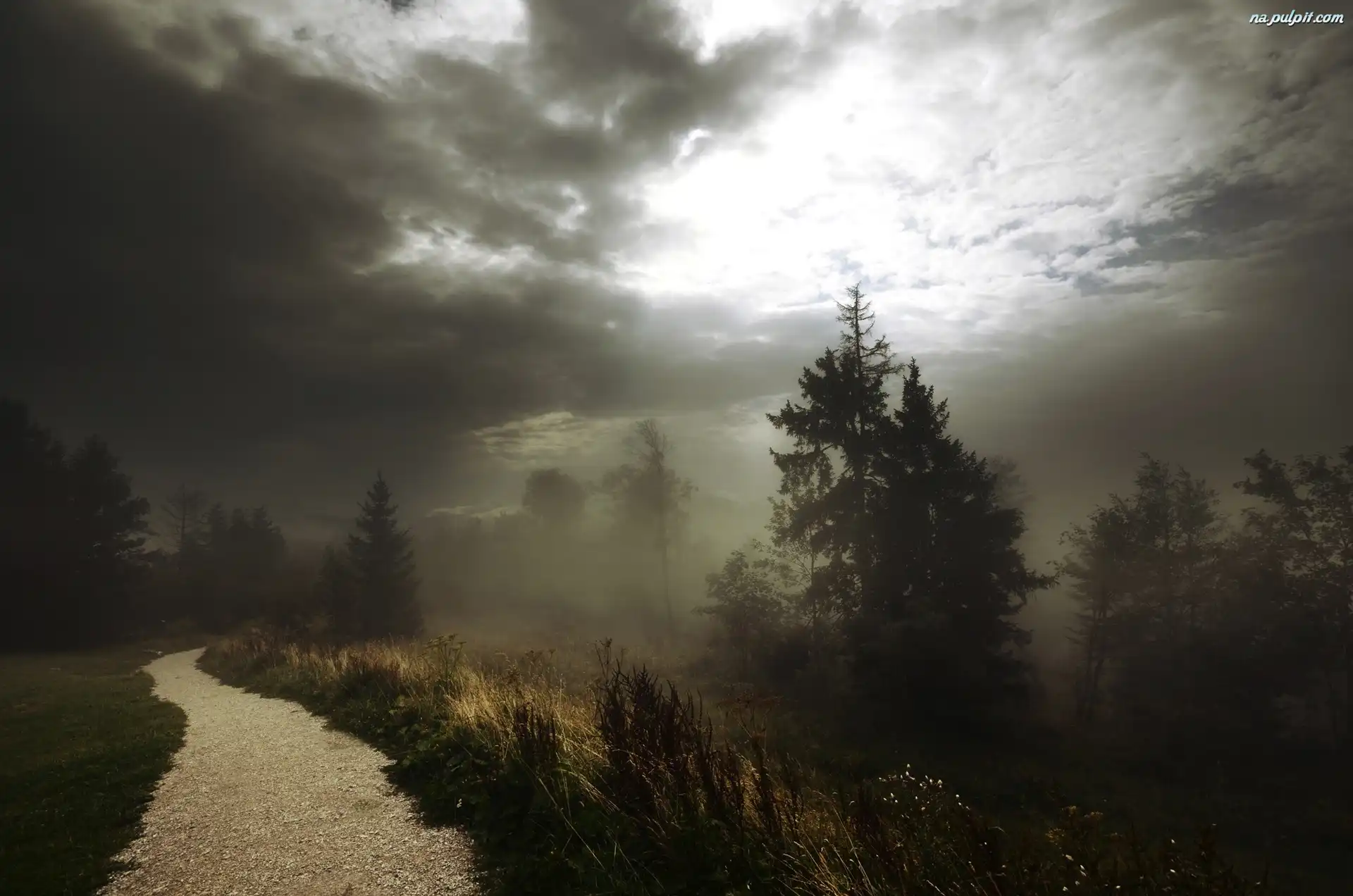 Chmury, Trawa, Droga, Las, Mgła Na Pulpit