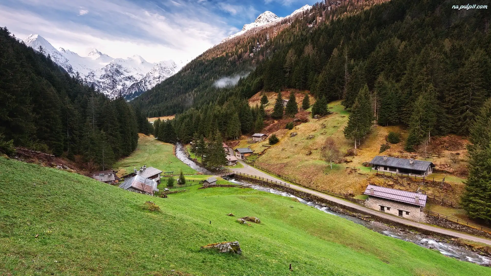 Ośnieżone, Drzewa, Chmury, Szczyty, Las, Domy, Droga, Most, Dolina, Góry, Rzeka Na Pulpit
