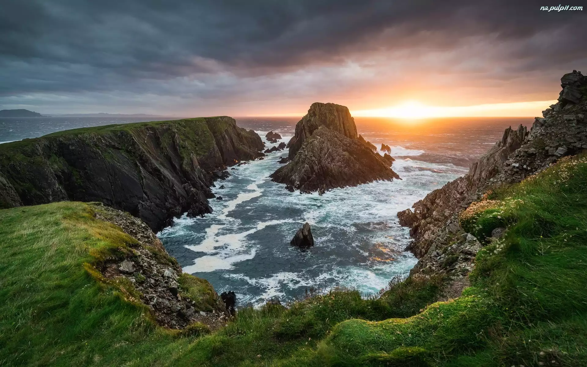 Irlandia, Hrabstwo Donegal, Skały, Zachód słońca, Chmury, Morze, Przylądek Malin Head Na Pulpit