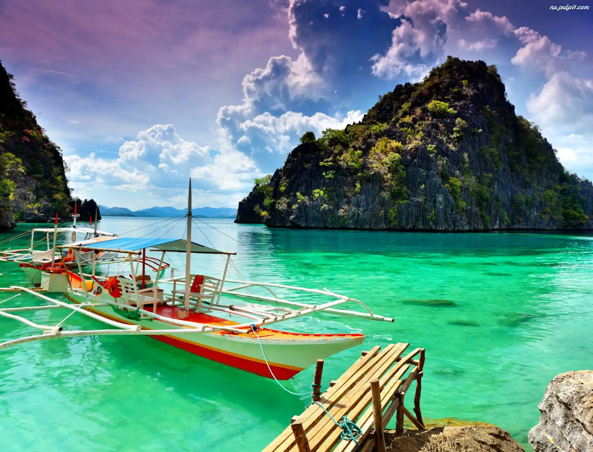 Łódka, Morze, Chmury, Skały Na Pulpit
