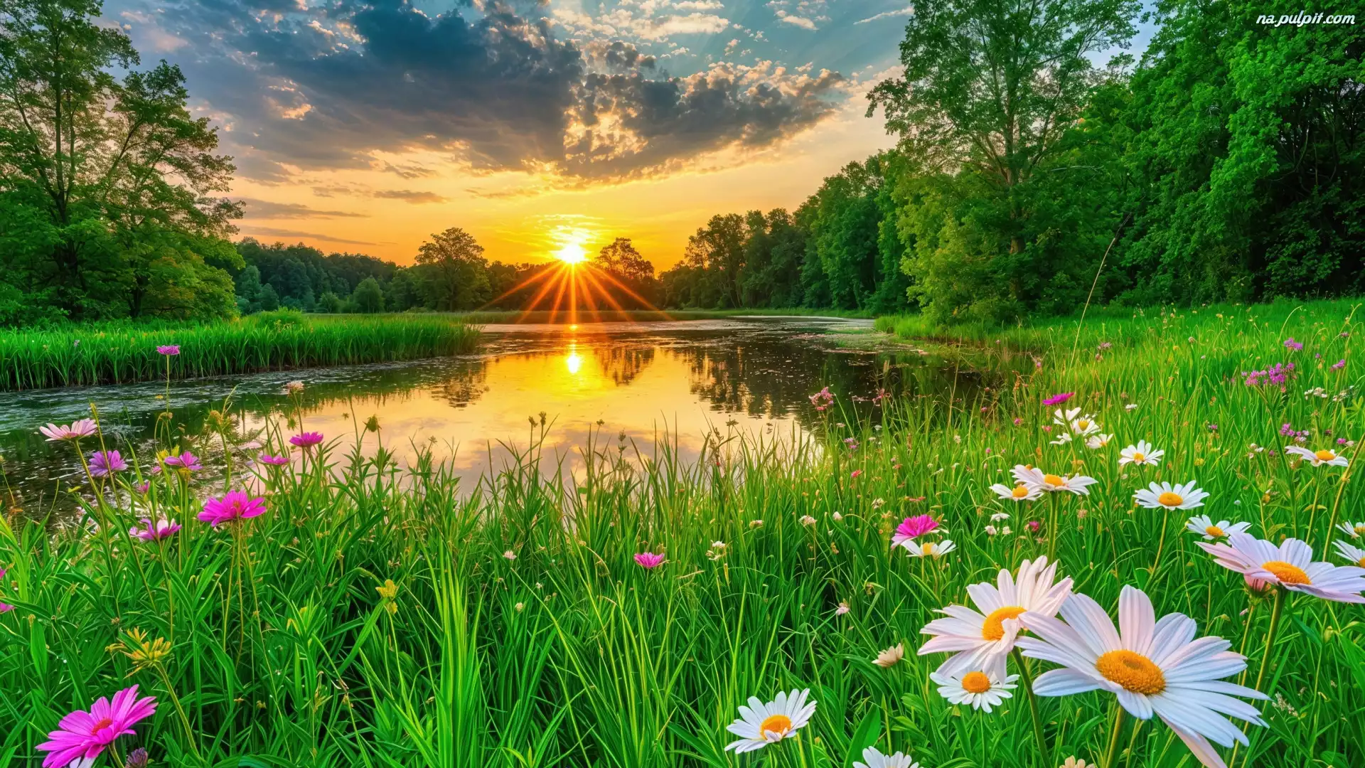 Chmury, Zachód słońca, Drzewa, Łąka, Trawa, Jezioro, Las, Niebo, Kwiaty Na Pulpit