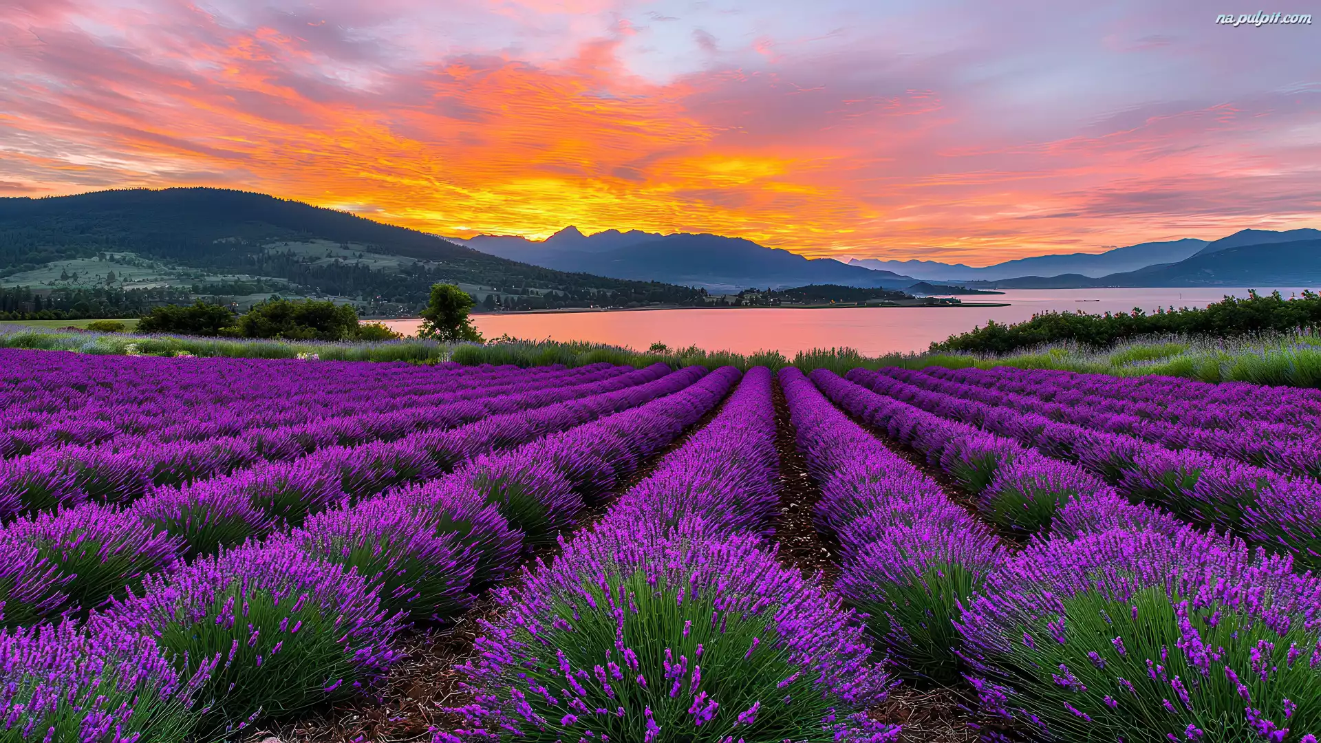 Zachód słońca, Niebo, Góry, Pole, Lawenda, Jezioro, Chmury Na Pulpit