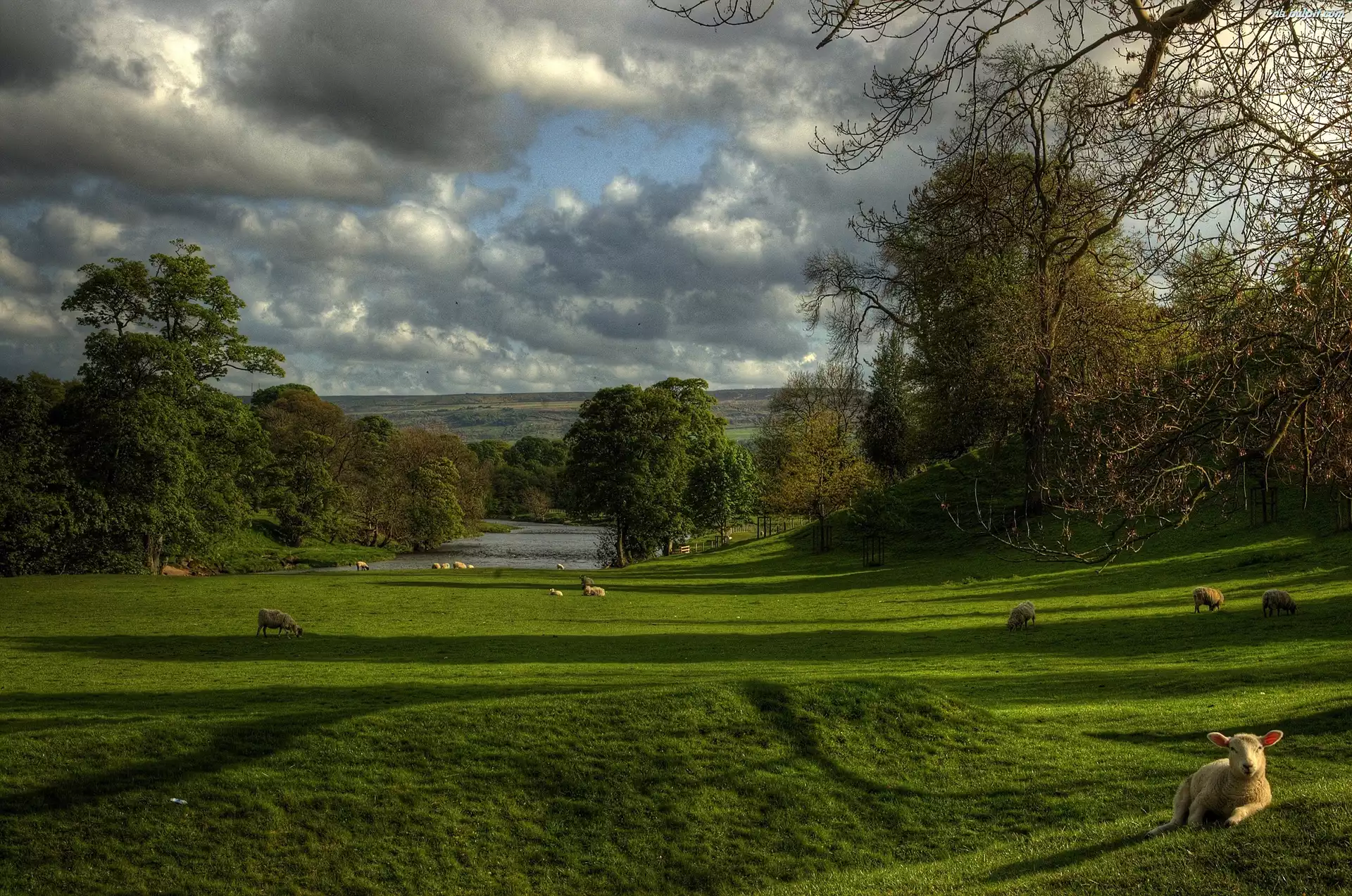 Chmury, Drzewa, Łąka, Owce, Rzeczka