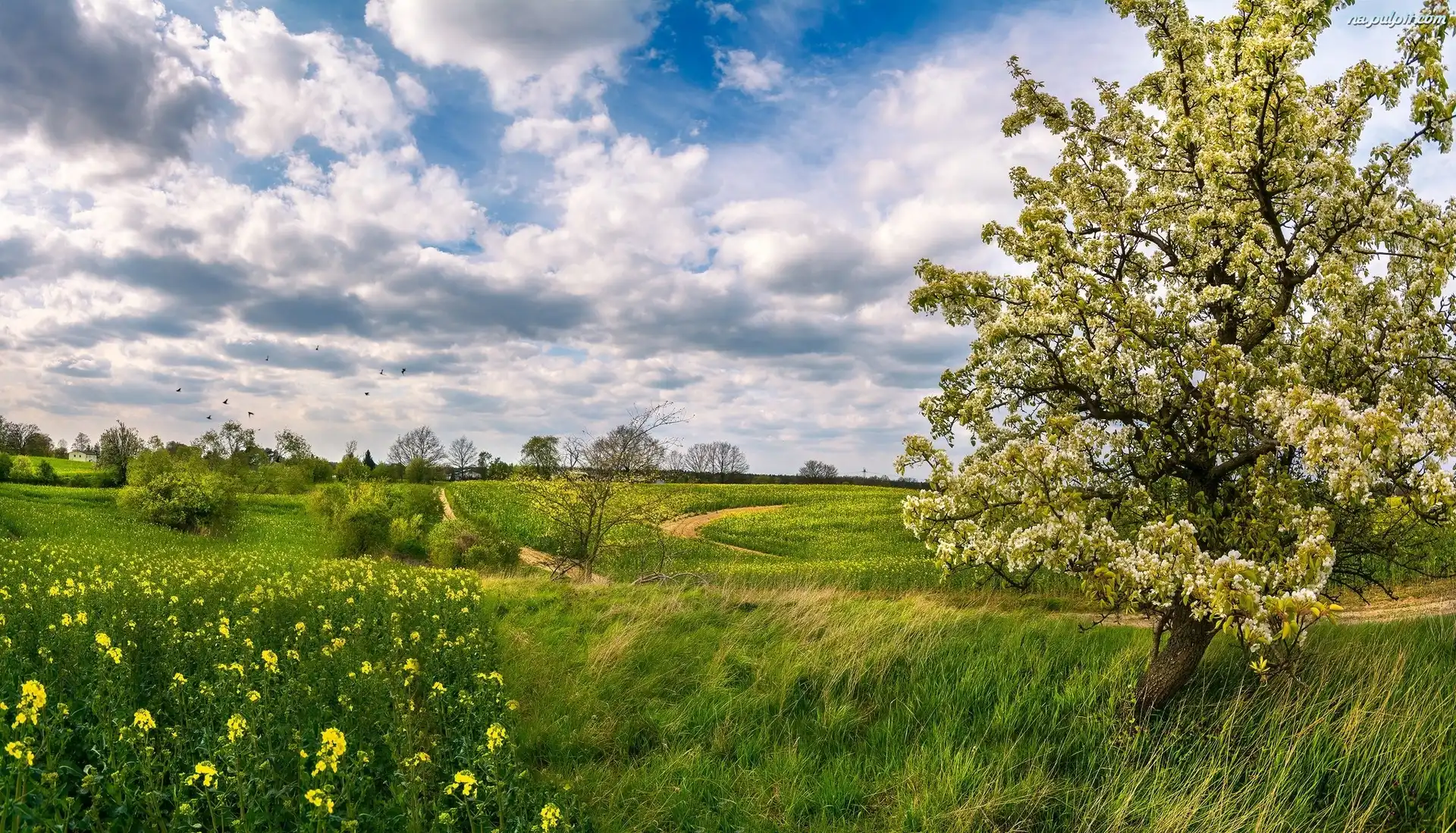 Chmury, Łąka, Pole, Drzewo
