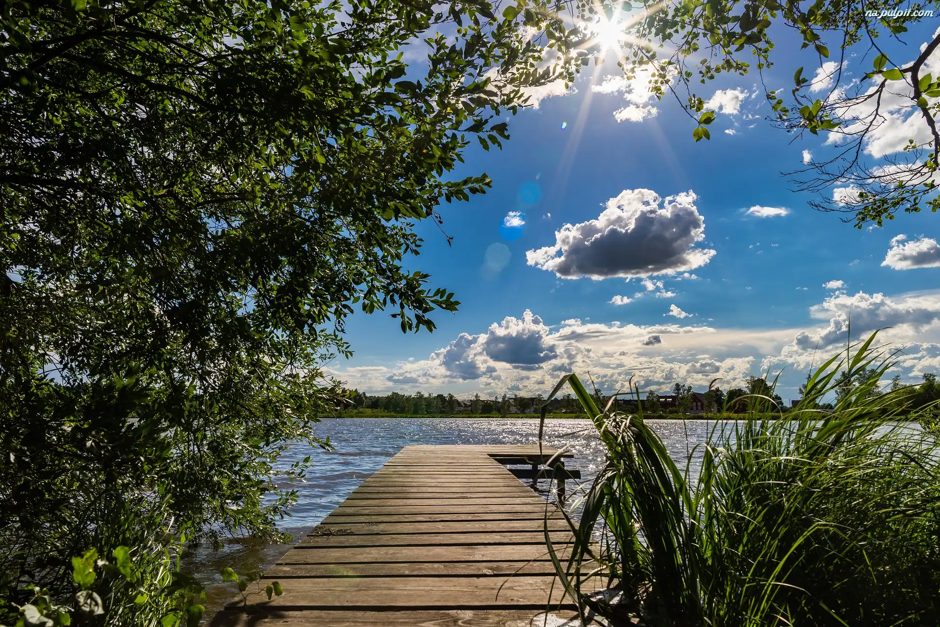 Pomost, Chmury, Promienie słońca, Drzewo, Jezioro, Szuwary