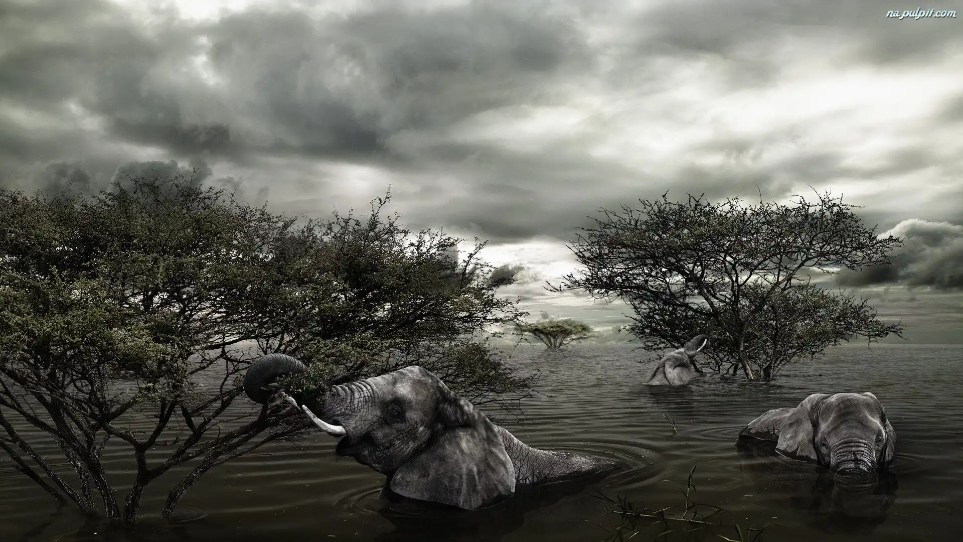 Chmury, Słonie, Powódź, Drzewa Na Pulpit