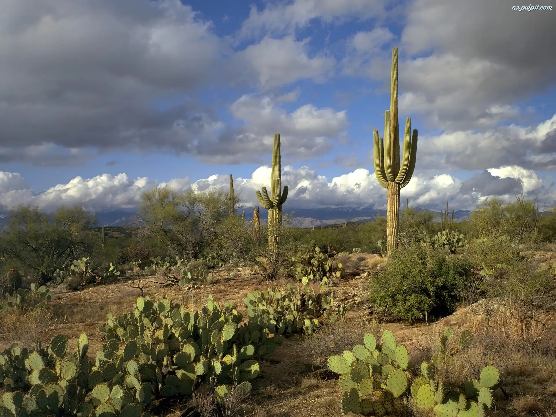 Park Narodowy Saguaro, Kaktusy, Opuncje, Karnegia olbrzymia, Stan Arizona, Stany Zjednoczone, Saguaro, Pustynia, Chmury Na Pulpit |