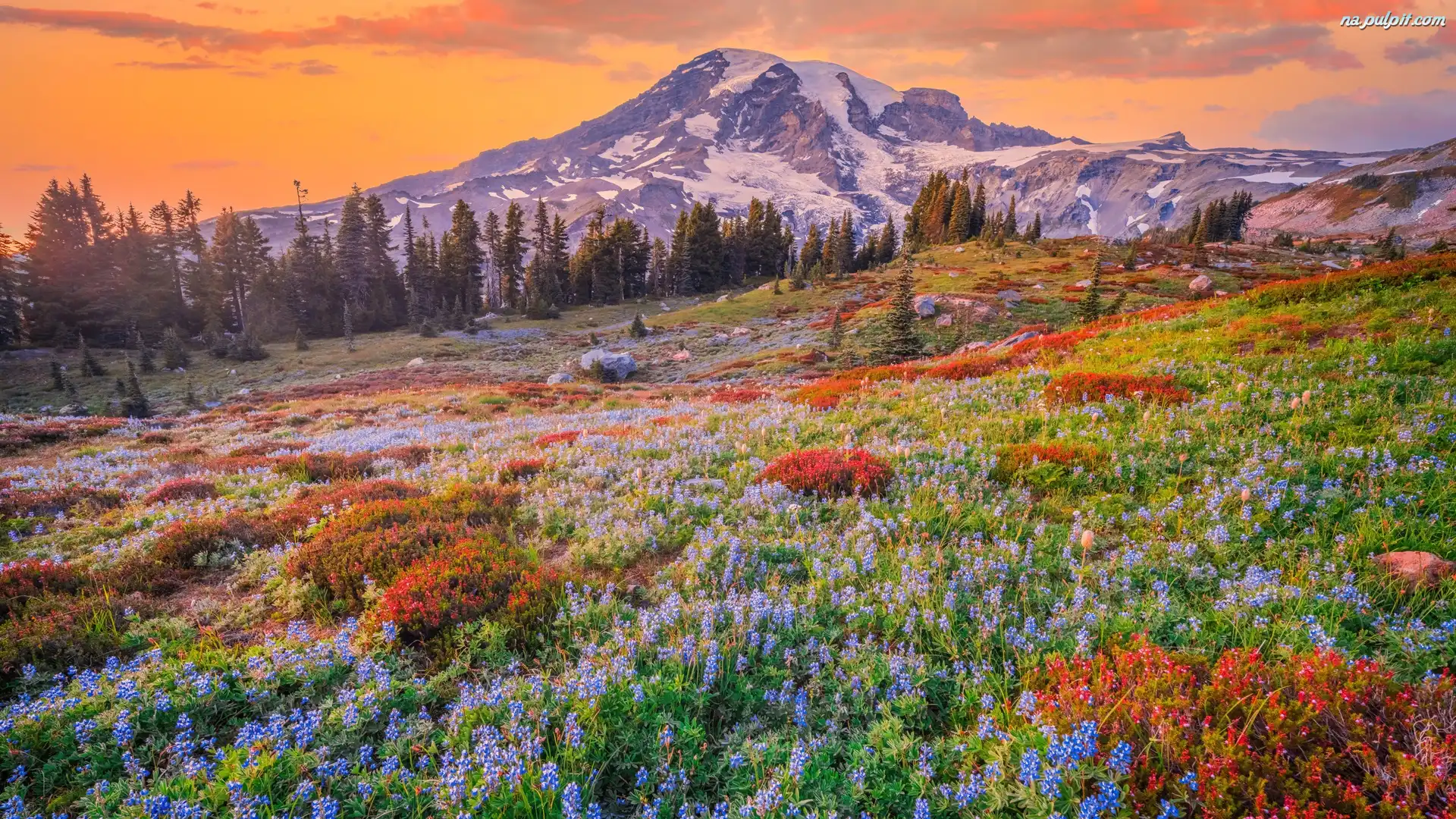 Chmury, Góry, Stratowulkan Mount Rainier, Drzewa, Stan Waszyngton, Stany Zjednoczone, Łąka, Park Narodowy Mount Rainier, Kwiaty Na Pulpit |