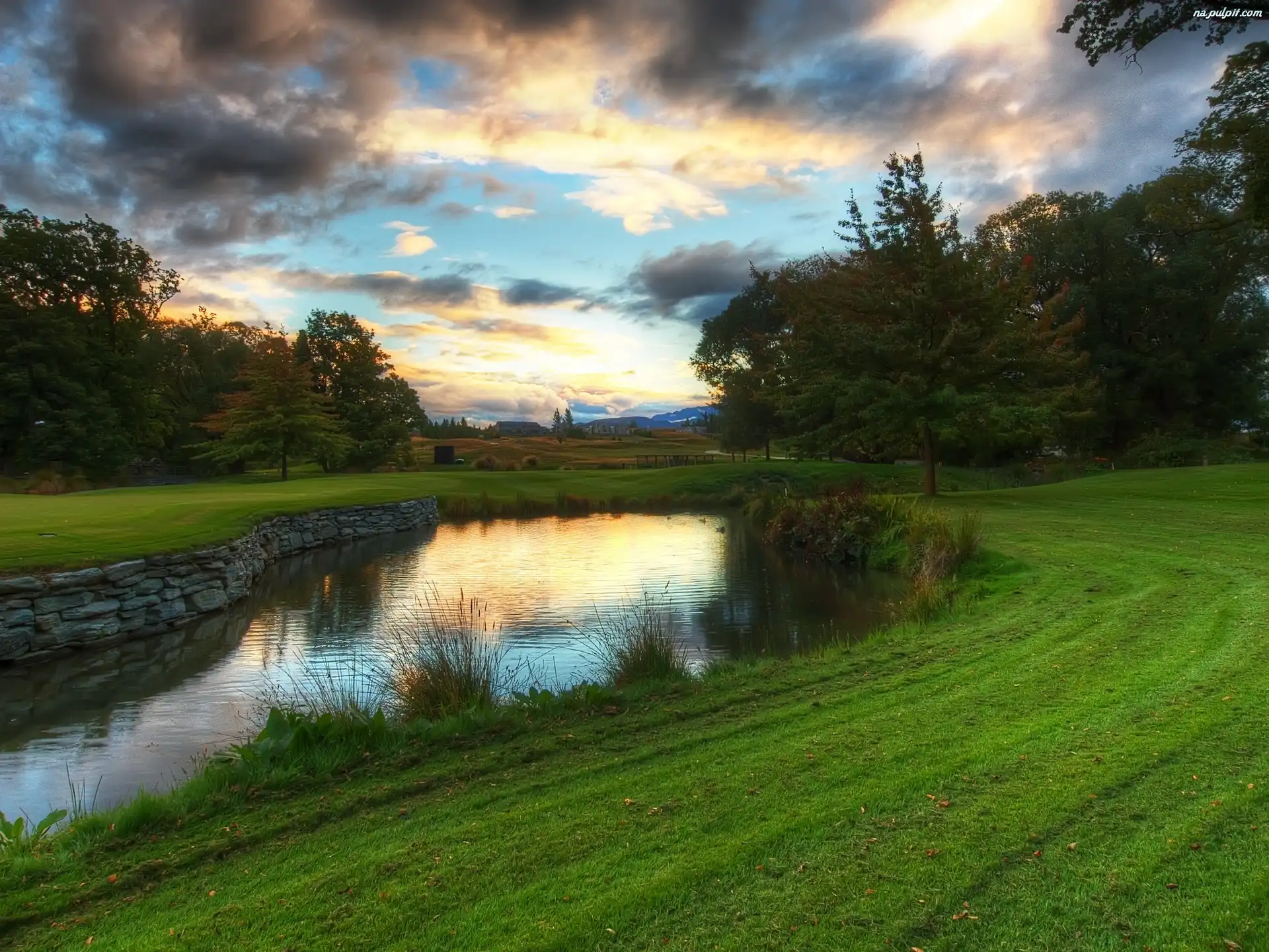 Chmury, Trawa, Rzeczka, Drzewa Na Pulpit