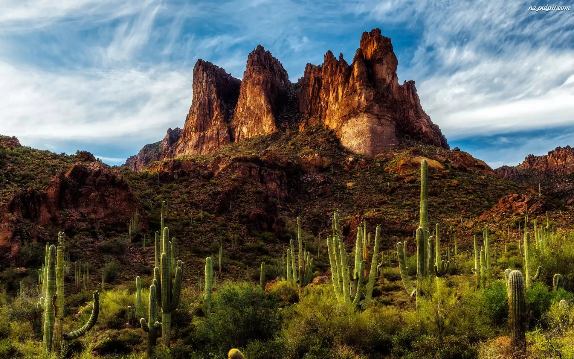 Szczyty, Pustynia, Rośliny, Góry, Sonoran Desert, Kaktusy saguaro, Tree Sisters, Stany Zjednoczone, Skały, Arizona, Superstition Mountains, Chmury Na Pulpit |