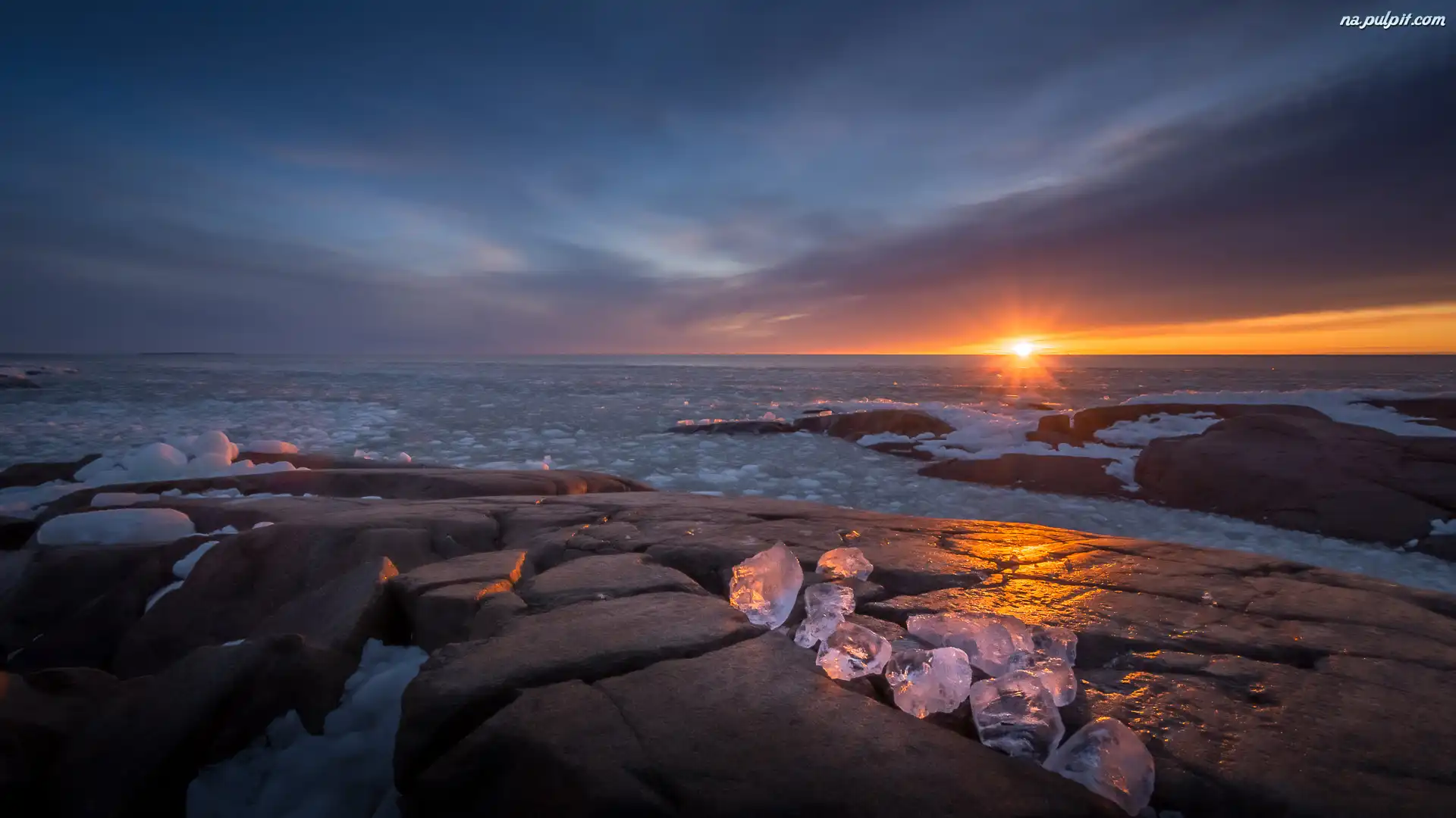 Lód, Chmury, Zima, Odbicie, Zachód słońca, Ocean, Skała Na Pulpit