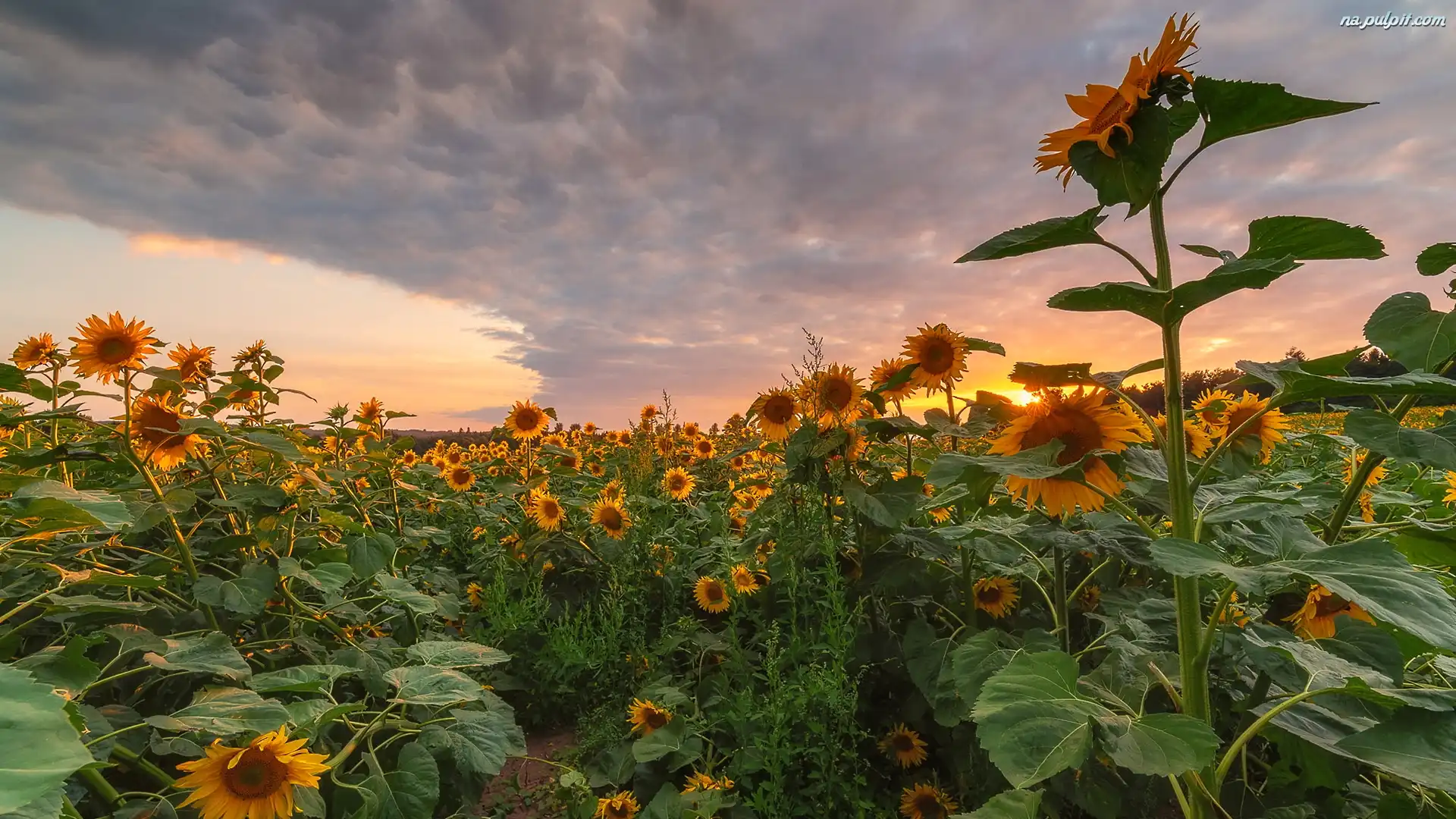 Chmury, Wschód słońca, Pole, Słoneczniki, Niebo Na Pulpit
