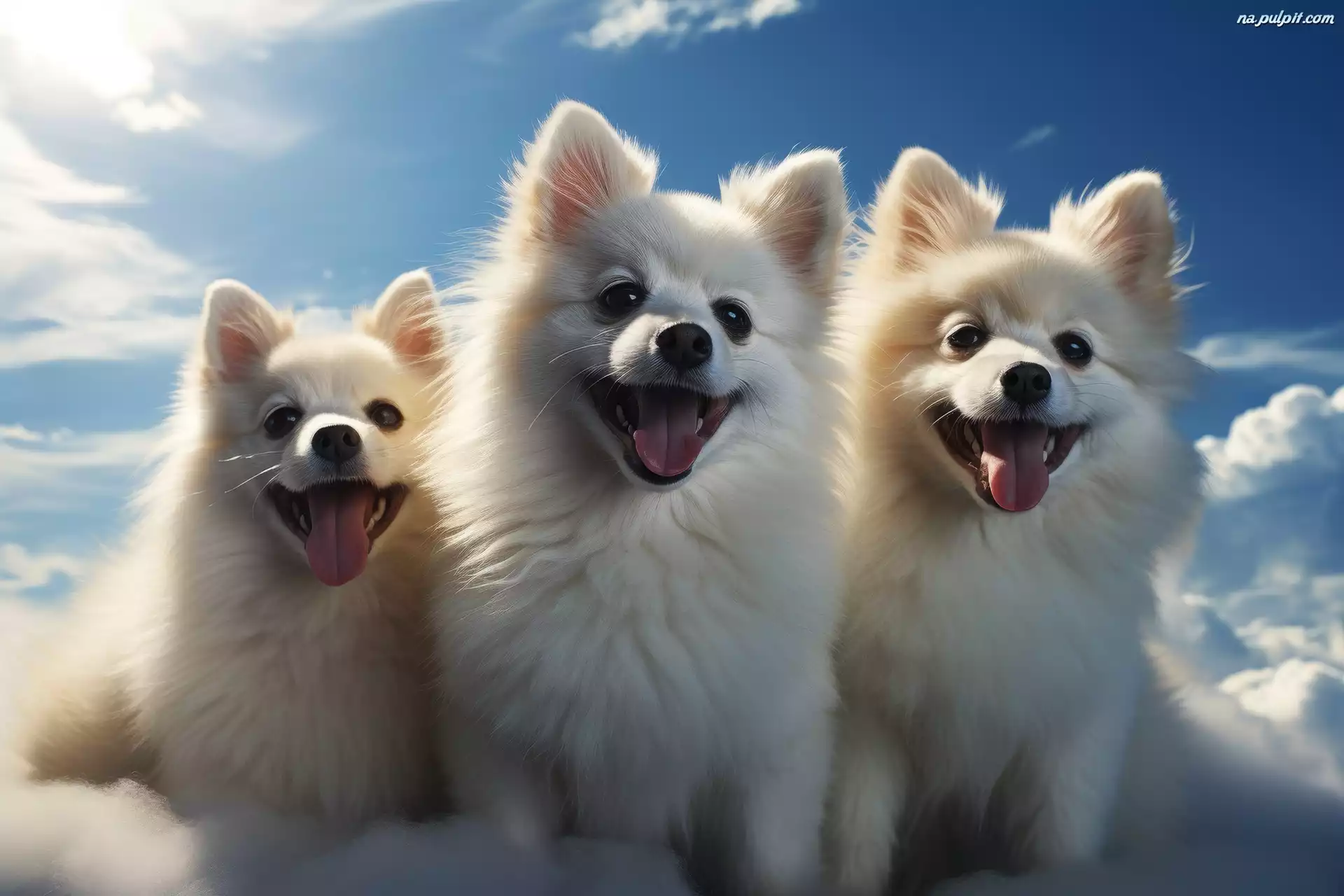 Grafika, Niebo, Szpice miniaturowe, Trzy, Białe, Psy, Chmury