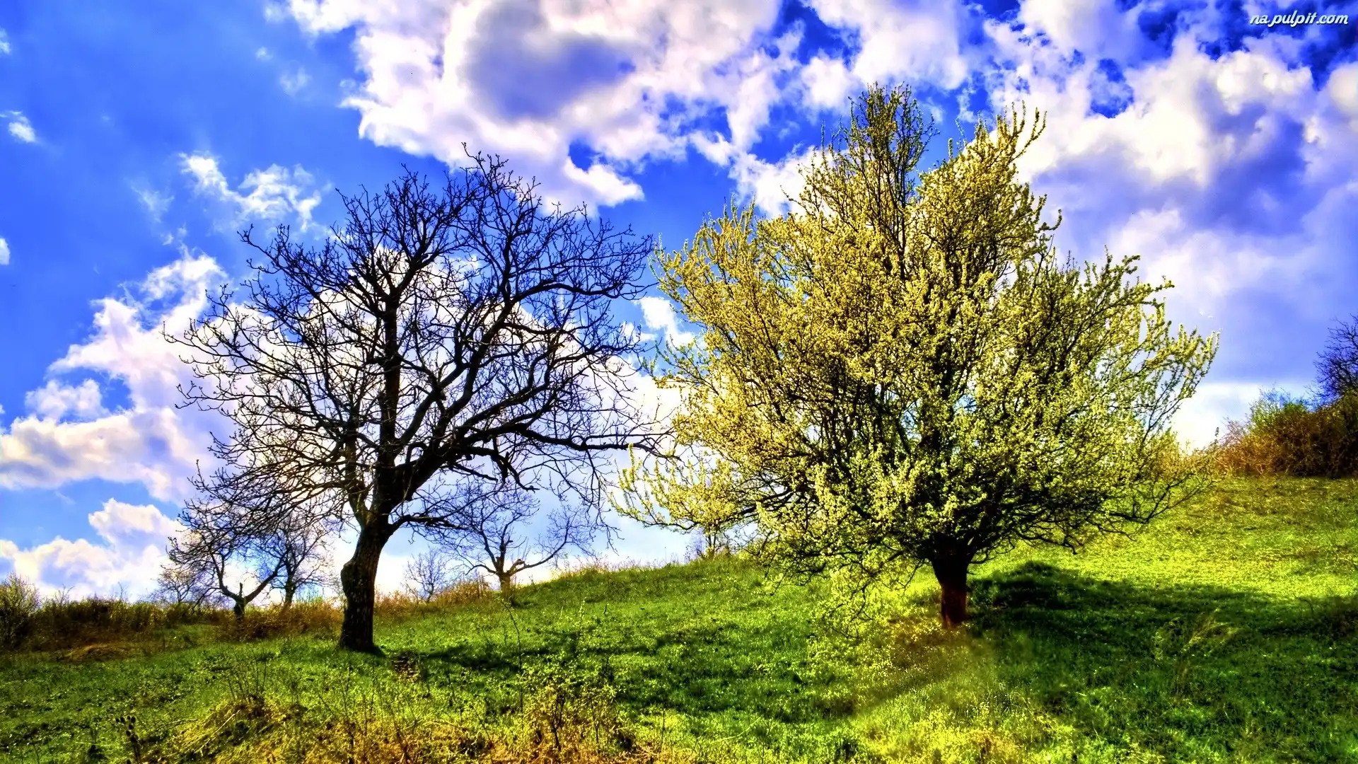 Chmury, Drzewa, Łąka, Trawa, Niebo Na Pulpit