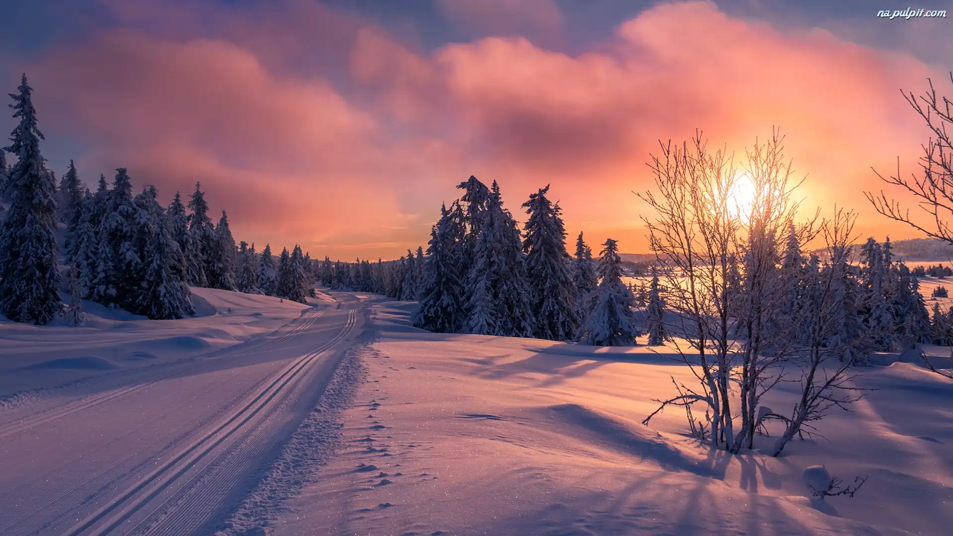 Chmury, Drzewa, Droga, Zima, Wschód słońca Na Pulpit