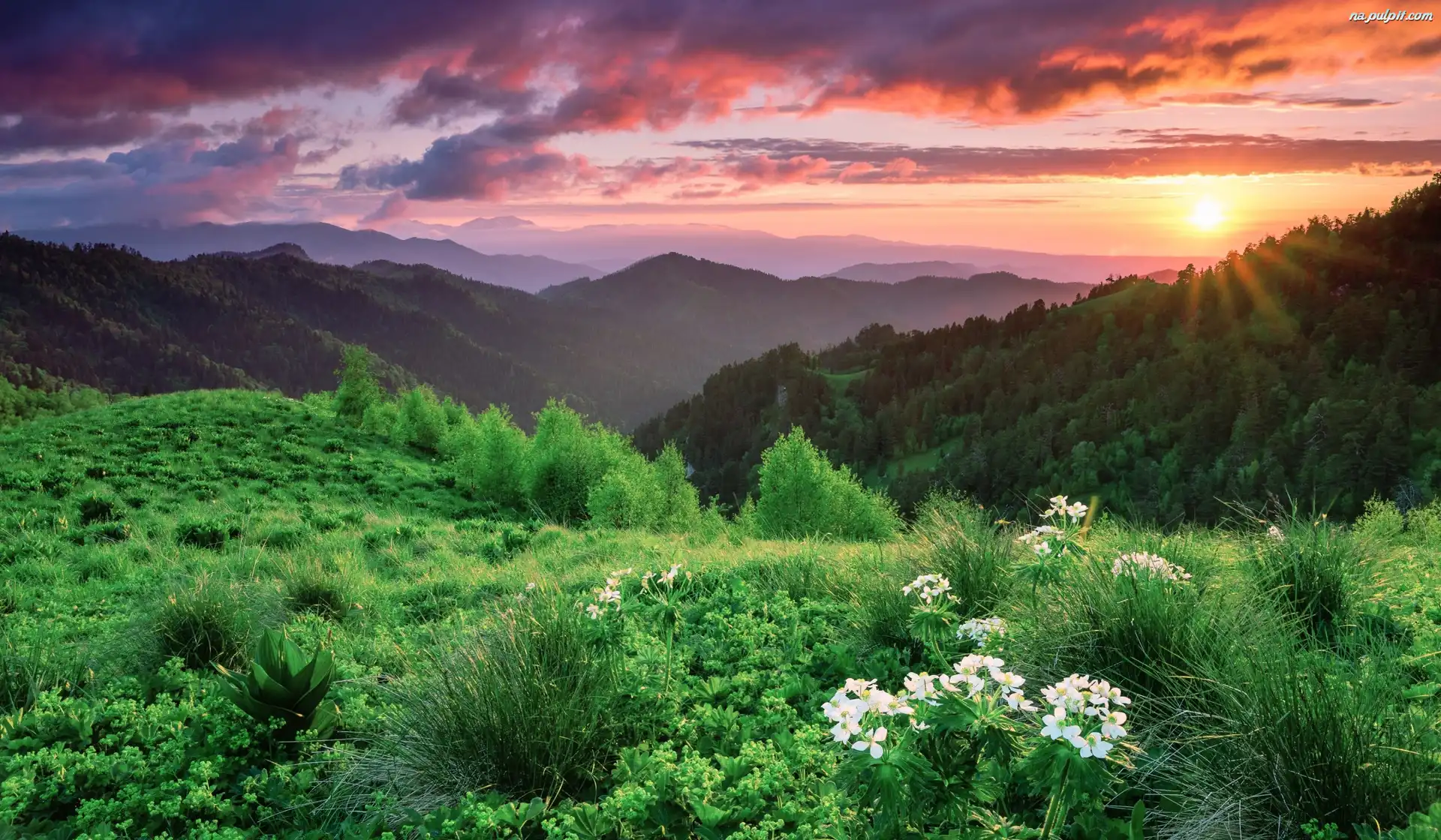 Chmury, Roślinność, Las, Góry, Wschód słońca Na Pulpit