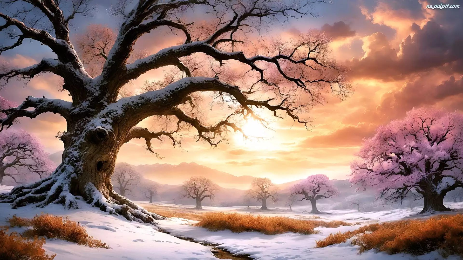 Paintography, Mgła, Wschód słońca, Zima, Góry, Drzewa, Chmury Na Pulpit