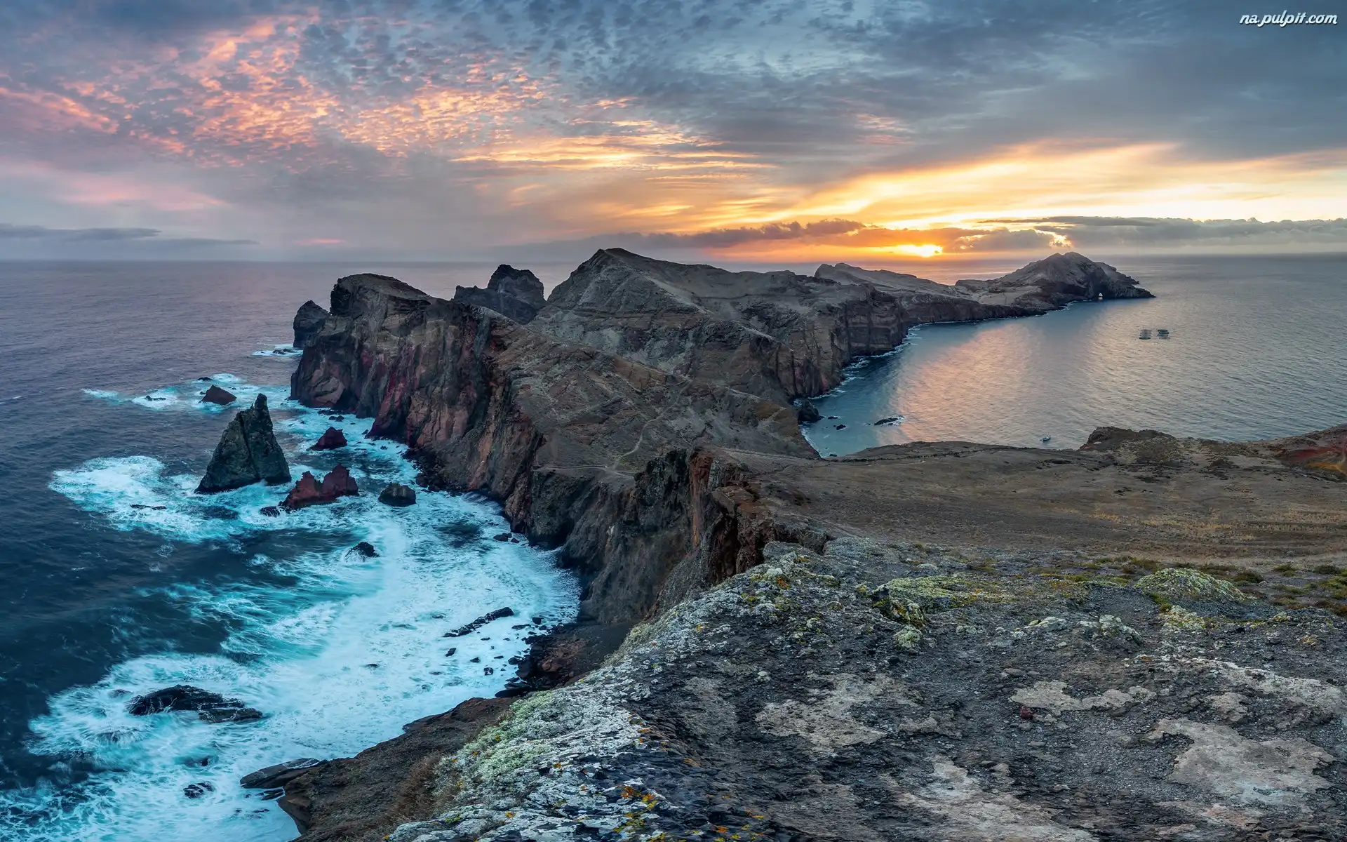Wybrzeże, Półwysep św Wawrzyńca, Skały, Portugalia, Chmury, Wschód słońca, Madera, Morze Na Pulpit |