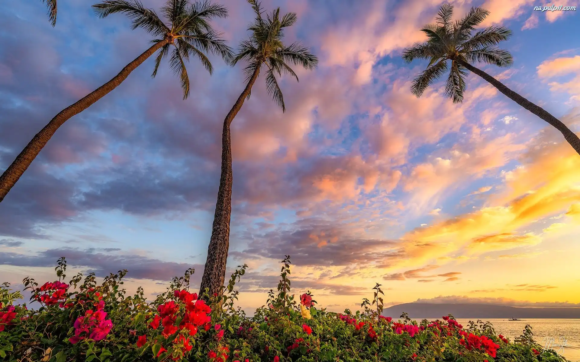 Chmury, Palmy, Morze, Stany Zjednoczone, Hawaje, Wyspa Maui, Kwiaty Na Pulpit