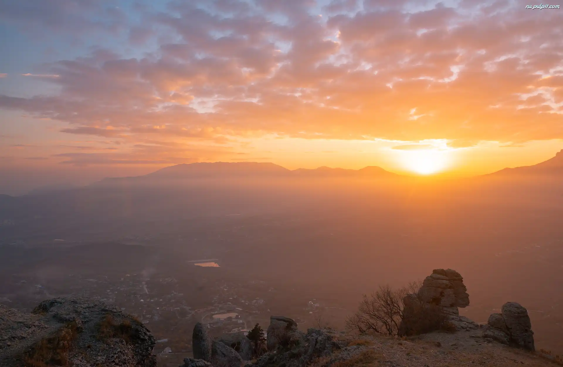 Wzgórza, Chmury, Wschód słońca, Góry, Skały, Mgła Na Pulpit