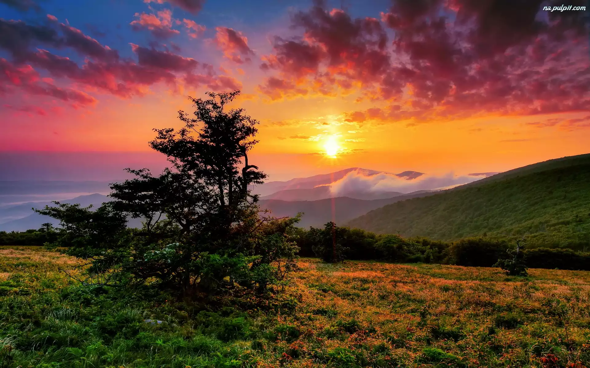 Chmury, Góry, Łąki, Drzewo, Zachód Słońca