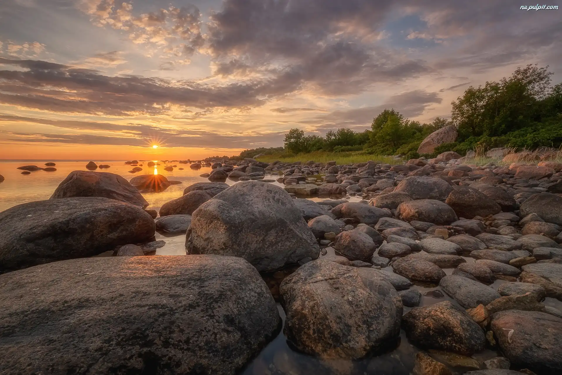 Chmury, Drzewa, Kamienie, Morze, Zachód słońca Na Pulpit