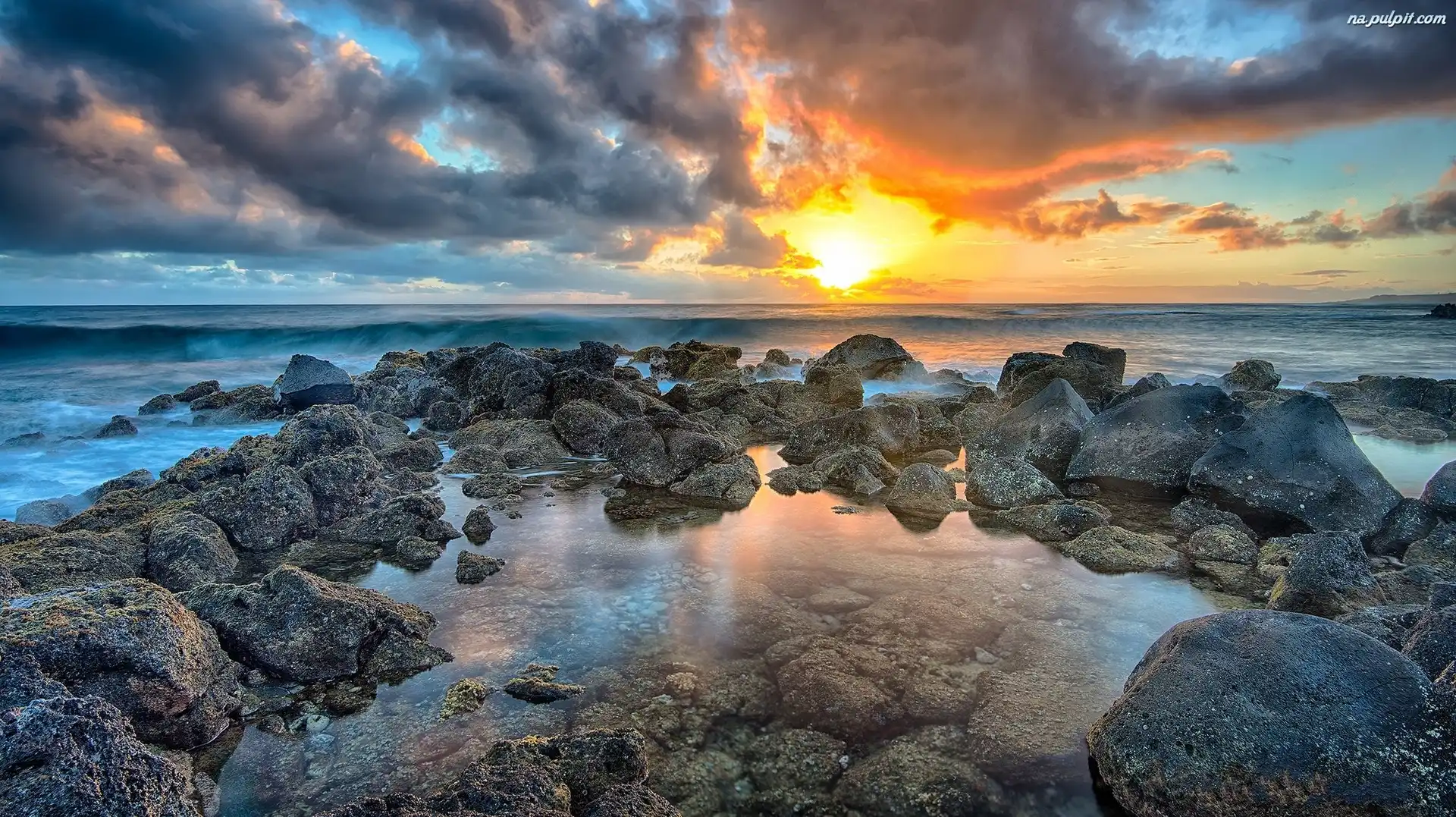 Chmury, Kamienie, Morze, Zachód słońca Na Pulpit