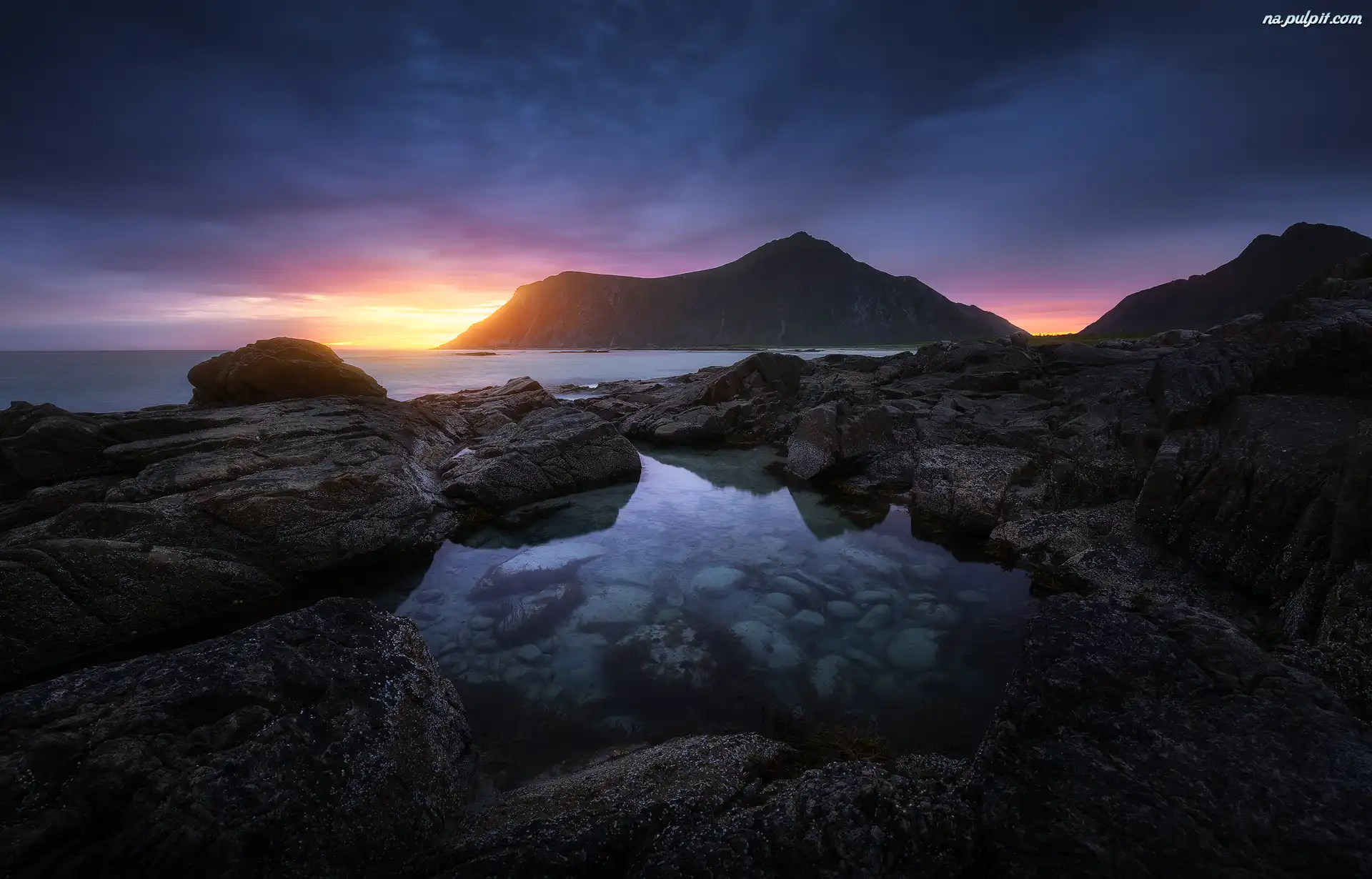 Chmury, Góra, Skały, Morze, Zachód słońca Na Pulpit