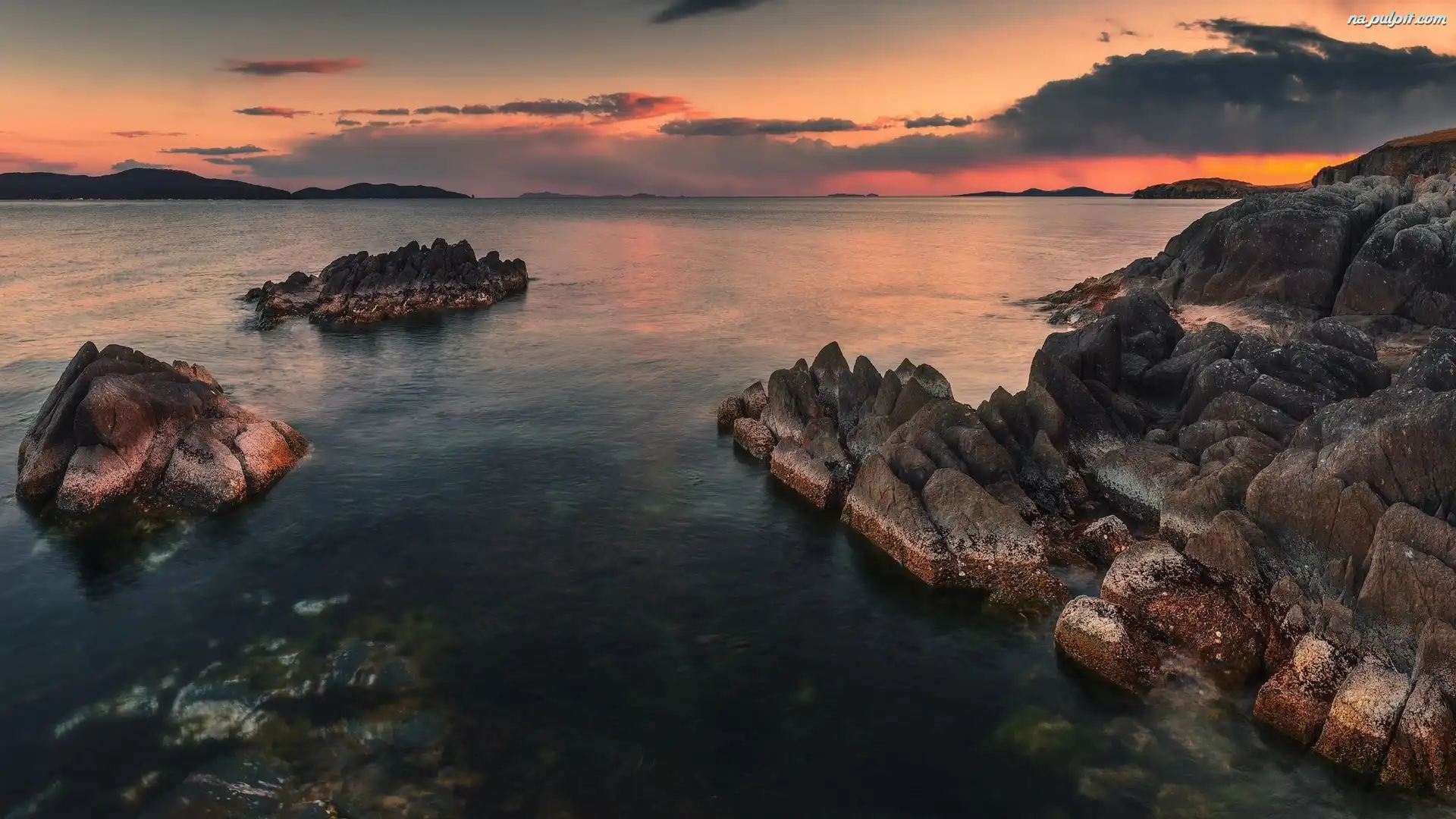 Chmury, Morze, Skały, Zachód słońca Na Pulpit
