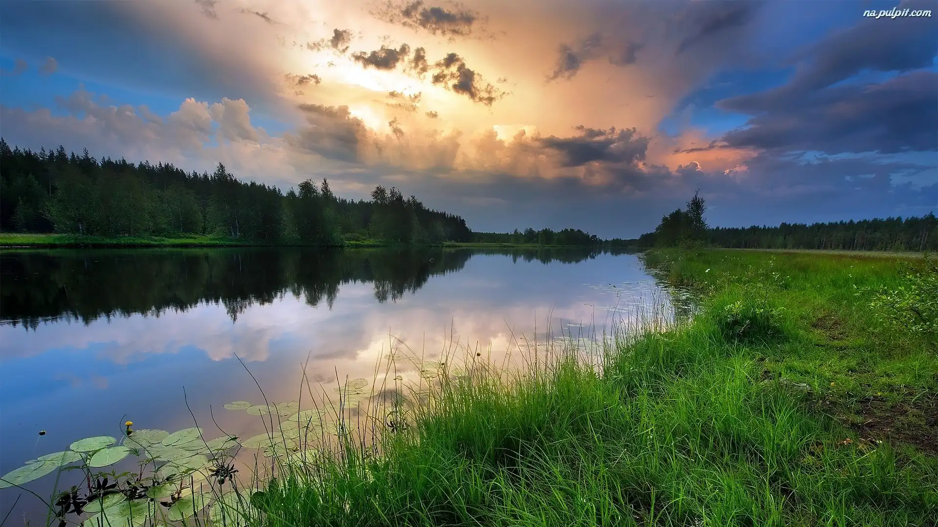 Chmury, Drzewa, Trawa, Rzeka, Zachód słońca Na Pulpit