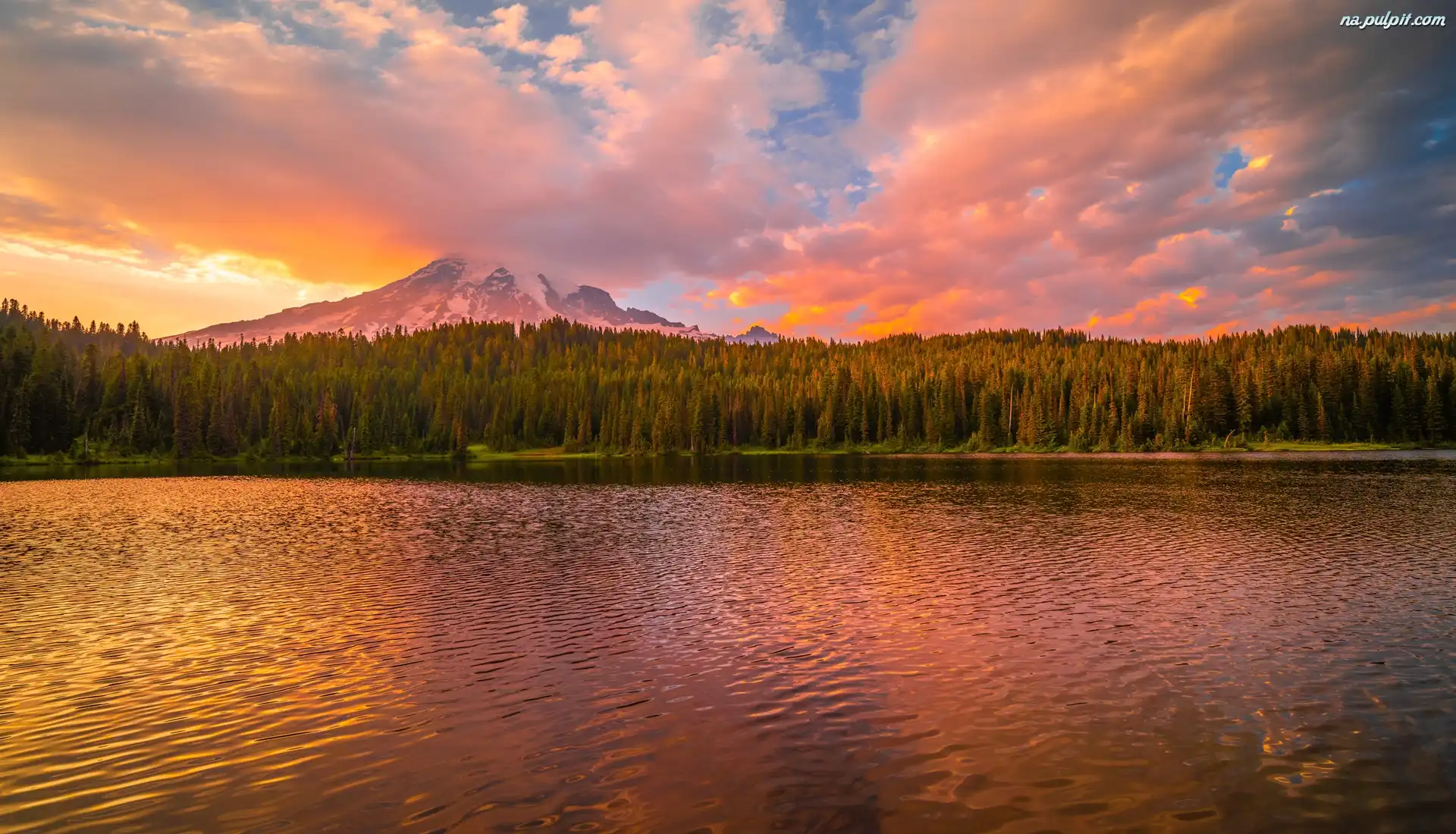 Chmury, Góra, Stratowulkan Mount Rainier, Jezioro, Stan Waszyngton, Stany Zjednoczone, Drzewa, Park Narodowy Mount Rainier, Zachód słońca Na Pulpit |